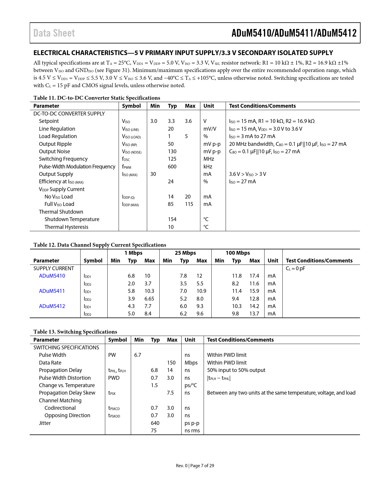 Data Sheet ADuM5410/ADuM5411/ADuM5412 ELECTRICAL CHARACTERISTICS—5 V PRIMARY INPUT SUPPLY/3.3 V SECONDARY ISOLATED SUPPLY