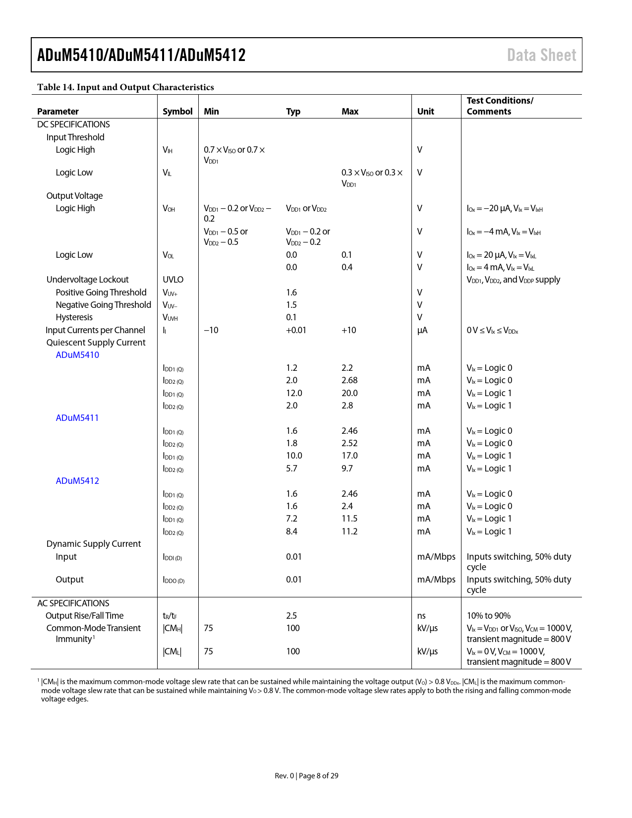 ADuM5410/ADuM5411/ADuM5412. Data Sheet. Table 14. Input and Output Characteristics. Test Conditions/. Parameter. Symbol Min. Typ. Max