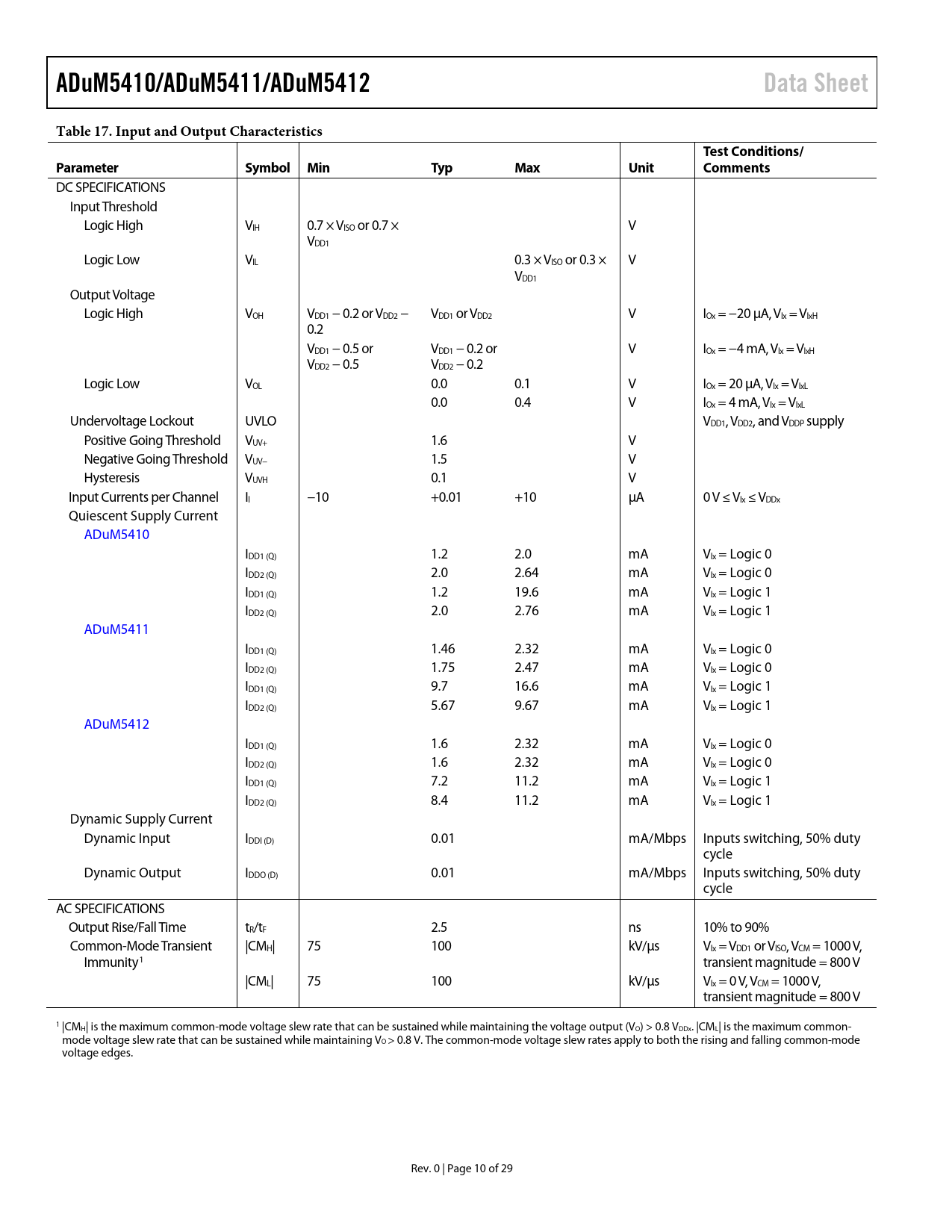 ADuM5410/ADuM5411/ADuM5412Data SheetTable 17. Input and Output CharacteristicsTest Conditions/ParameterSymbol MinTypMaxUnitComments DC SPECIFICATIONS Input Threshold Logic High VIH 0.7 × VISO or 0.7 × V VDD1 Logic Low VIL 0.3 × VISO or 0.3 × V VDD1 Output Voltage Logic High VOH VDD1 − 0.2 or VDD2 − VDD1 or VDD2 V IOx = −20 µA, VIx = VIxH 0.2 VDD1 − 0.5 or VDD1 − 0.2 or V IOx = −4 mA, VIx = VIxH VDD2 − 0.5 VDD2 − 0.2 Logic Low VOL 0.0 0.1 V IOx = 20 µA, VIx = VIxL 0.0 0.4 V IOx = 4 mA, VIx = VIxL Undervoltage Lockout UVLO VDD1, VDD2, and VDDP supply Positive Going Threshold VUV+ 1.6 V Negative Going Threshold VUV− 1.5 V Hysteresis VUVH 0.1 V Input Currents per Channel II −10 +0.01 +10 µA 0 V ≤ VIx ≤ VDDx Quiescent Supply Current ADuM5410 IDD1 (Q) 1.2 2.0 mA VIx = Logic 0 IDD2 (Q) 2.0 2.64 mA VIx = Logic 0 IDD1 (Q) 1.2 19.6 mA VIx = Logic 1 IDD2 (Q) 2.0 2.76 mA VIx = Logic 1 ADuM5411 IDD1 (Q) 1.46 2.32 mA VIx = Logic 0 IDD2 (Q) 1.75 2.47 mA VIx = Logic 0 IDD1 (Q) 9.7 16.6 mA VIx = Logic 1 IDD2 (Q) 5.67 9.67 mA VIx = Logic 1 ADuM5412 IDD1 (Q) 1.6 2.32 mA VIx = Logic 0 IDD2 (Q) 1.6 2.32 mA VIx = Logic 0 IDD1 (Q) 7.2 11.2 mA VIx = Logic 1 IDD2 (Q) 8.4 11.2 mA VIx = Logic 1 Dynamic Supply Current Dynamic Input IDDI (D) 0.01 mA/Mbps Inputs switching, 50% duty cycle Dynamic Output IDDO (D) 0.01 mA/Mbps Inputs switching, 50% duty cycle AC SPECIFICATIONS Output Rise/Fall Time tR/tF 2.5 ns 10% to 90% Common-Mode Transient |CMH| 75 100 kV/µs VIx = VDD1 or VISO, VCM = 1000 V, Immunity1 transient magnitude = 800 V |CML| 75 100 kV/µs VIx = 0 V, VCM = 1000 V, transient magnitude = 800 V 1 |CMH| is the maximum common-mode voltage slew rate that can be sustained while maintaining the voltage output (VO) > 0.8 VDDx. |CML| is the maximum common- mode voltage slew rate that can be sustained while maintaining VO > 0.8 V. The common-mode voltage slew rates apply to both the rising and falling common-mode voltage edges. Rev. 0 | Page 10 of 29 Document Outline FEATURES APPLICATIONS GENERAL DESCRIPTION FUNCTIONAL BLOCK DIGRAM REVISION HISTORY SPECIFICATIONS ELECTRICAL CHARACTERISTICS—5 V PRIMARY INPUT SUPPLY/5 V SECONDARY ISOLATED SUPPLY ELECTRICAL CHARACTERISTICS—3.3 V PRIMARY INPUT SUPPLY/3.3 V SECONDARY ISOLATED SUPPLY ELECTRICAL CHARACTERISTICS—5 V PRIMARY INPUT SUPPLY/3.3 V SECONDARY ISOLATED SUPPLY ELECTRICAL CHARACTERISTICS—2.5 V OPERATION DIGITAL ISOLATOR CHANNELS ONLY ELECTRICAL CHARACTERISTICS—1.8 V OPERATION DIGITAL ISOLATOR CHANNELS ONLY PACKAGE CHARACTERISTICS REGULATORY APPROVALS INSULATION AND SAFETY RELATED SPECIFICATIONS DIN V VDE V 0884-10 (VDE V 0884-10) INSULATION CHARACTERISTICS RECOMMENDED OPERATING CONDITIONS ABSOLUTE MAXIMUM RATINGS ESD CAUTION PIN CONFIGURATIONS AND FUNCTION DESCRIPTIONS TRUTH TABLES TYPICAL PERFORMANCE CHARACTERISTICS TERMINOLOGY THEORY OF OPERATION APPLICATIONS INFORMATION PCB LAYOUT THERMAL ANALYSIS PROPAGATION DELAY RELATED PARAMETERS EMI CONSIDERATIONS POWER CONSUMPTION INSULATION LIFETIME Surface Tracking Insulation Wear Out Calculation and Use of Parameters Example OUTLINE DIMENSIONS ORDERING GUIDE