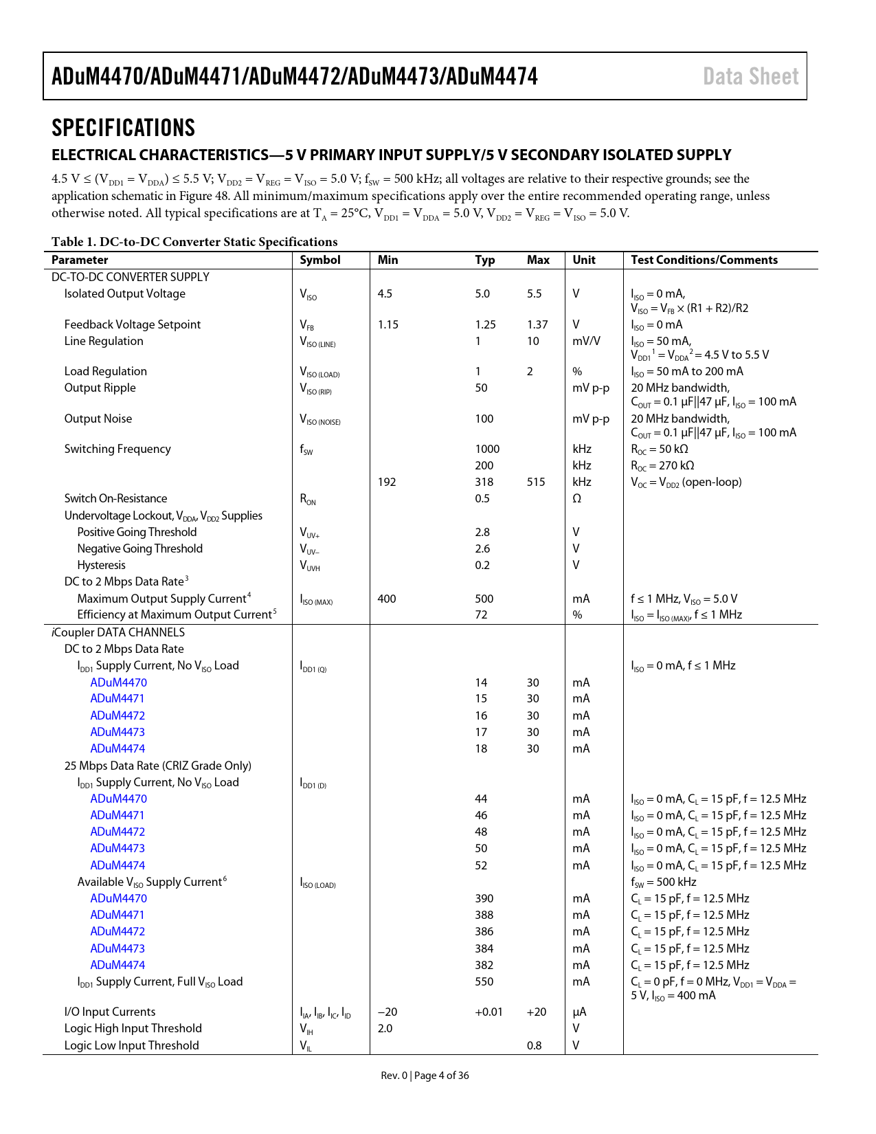 ADuM4470/ADuM4471/ADuM4472/ADuM4473/ADuM4474 Data Sheet SPECIFICATIONS ELECTRICAL CHARACTERISTICS—5 V PRIMARY INPUT SUPPLY/5 V SECONDARY ISOLATED SUPPLY