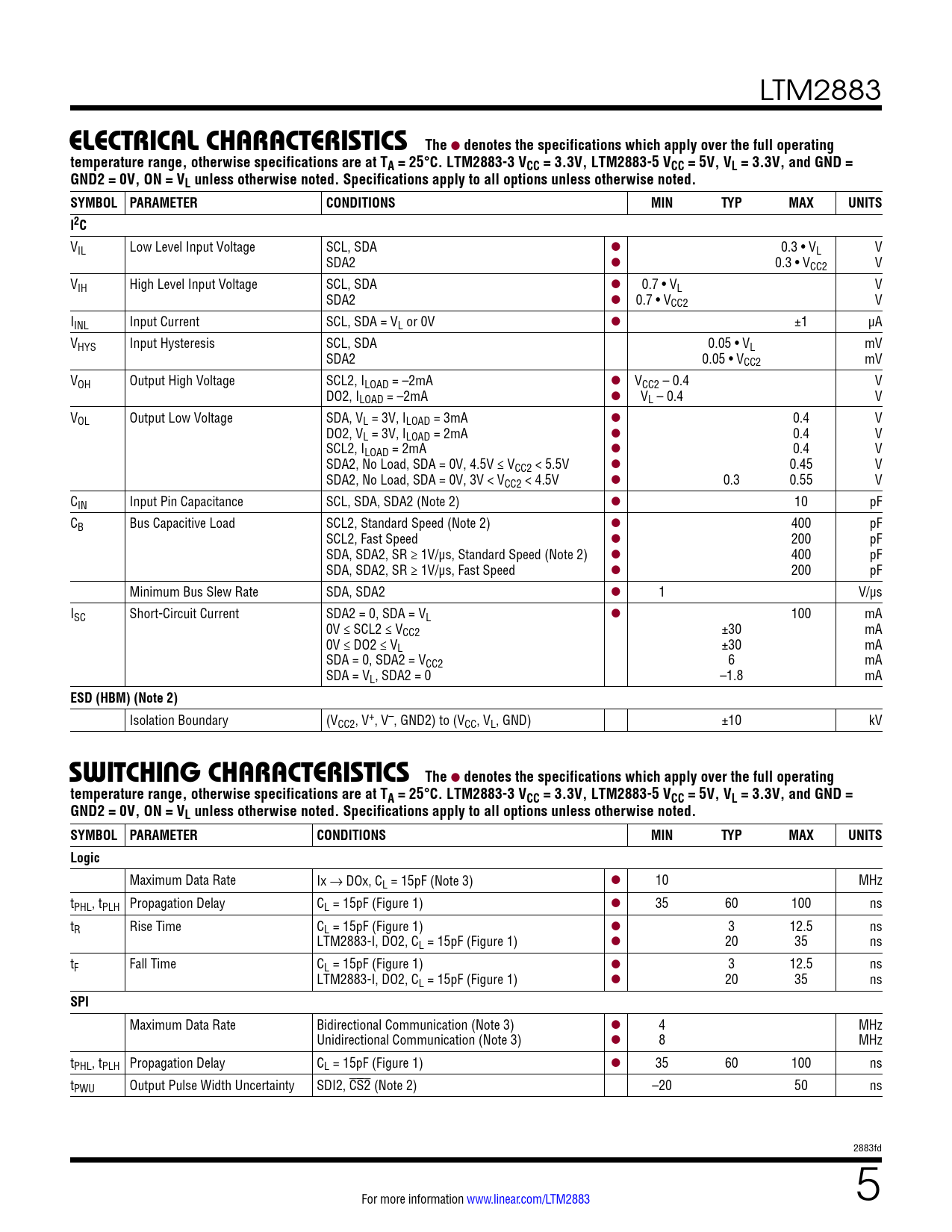 LTM2883 ELECTRICALCHARACTERISTICS The l denotes the specifications which apply over the full operatingtemperature range, otherwise specifications are at TA = 25°C. LTM2883-3 VCC = 3.3V, LTM2883-5 VCC = 5V, VL = 3.3V, and GND =GND2 = 0V, ON = VL unless otherwise noted. Specifications apply to all options unless otherwise noted. SYMBOL PARAMETERCONDITIONSMINTYPMAXUNITSI2C VIL Low Level Input Voltage SCL, SDA l 0.3 • VL V SDA2 l 0.3 • VCC2 V VIH High Level Input Voltage SCL, SDA l 0.7 • VL V SDA2 l 0.7 • VCC2 V IINL Input Current SCL, SDA = VL or 0V l ±1 µA VHYS Input Hysteresis SCL, SDA 0.05 • VL mV SDA2 0.05 • VCC2 mV VOH Output High Voltage SCL2, ILOAD = –2mA l VCC2 – 0.4 V DO2, ILOAD = –2mA l VL – 0.4 V VOL Output Low Voltage SDA, VL = 3V, ILOAD = 3mA l 0.4 V DO2, VL = 3V, ILOAD = 2mA l 0.4 V SCL2, ILOAD = 2mA l 0.4 V SDA2, No Load, SDA = 0V, 4.5V ≤ VCC2 < 5.5V l 0.45 V SDA2, No Load, SDA = 0V, 3V < VCC2 < 4.5V l 0.3 0.55 V CIN Input Pin Capacitance SCL, SDA, SDA2 (Note 2) l 10 pF CB Bus Capacitive Load SCL2, Standard Speed (Note 2) l 400 pF SCL2, Fast Speed l 200 pF SDA, SDA2, SR ≥ 1V/μs, Standard Speed (Note 2) l 400 pF SDA, SDA2, SR ≥ 1V/μs, Fast Speed l 200 pF Minimum Bus Slew Rate SDA, SDA2 l 1 V/µs ISC Short-Circuit Current SDA2 = 0, SDA = VL l 100 mA 0V ≤ SCL2 ≤ VCC2 ±30 mA 0V ≤ DO2 ≤ VL ±30 mA SDA = 0, SDA2 = VCC2 6 mA SDA = VL, SDA2 = 0 –1.8 mA ESD (HBM) (Note 2) Isolation Boundary (VCC2, V+, V–, GND2) to (VCC, VL, GND) ±10 kV SWITCHINGCHARACTERISTICS The l denotes the specifications which apply over the full operatingtemperature range, otherwise specifications are at TA = 25°C. LTM2883-3 VCC = 3.3V, LTM2883-5 VCC = 5V, VL = 3.3V, and GND =GND2 = 0V, ON = VL unless otherwise noted. Specifications apply to all options unless otherwise noted. SYMBOL PARAMETERCONDITIONSMINTYPMAXUNITSLogic Maximum Data Rate Ix → DOx, CL = 15pF (Note 3) l 10 MHz tPHL, tPLH Propagation Delay CL = 15pF (Figure 1) l 35 60 100 ns tR Rise Time CL = 15pF (Figure 1) l 3 12.5 ns LTM2883-I, DO2, CL = 15pF (Figure 1) l 20 35 ns tF Fall Time CL = 15pF (Figure 1) l 3 12.5 ns LTM2883-I, DO2, CL = 15pF (Figure 1) l 20 35 ns SPI Maximum Data Rate Bidirectional Communication (Note 3) l 4 MHz Unidirectional Communication (Note 3) l 8 MHz tPHL, tPLH Propagation Delay CL = 15pF (Figure 1) l 35 60 100 ns tPWU Output Pulse Width Uncertainty SDI2, CS2 (Note 2) –20 50 ns 2883fd For more information www.linear.com/LTM2883 5 Document Outline Features Applications Description Typical Application Absolute Maximum Ratings Pin Configuration Order Information Electrical Characteristics Switching Characteristics Isolation Characteristics Typical Performance Characteristics Pin Functions Block Diagram Test Circuits Applications Information Package Description Typical Application Related Parts