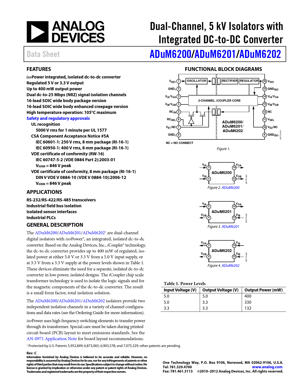 Datasheet ADuM6200, ADuM6201, ADuM6202 (Analog Devices)