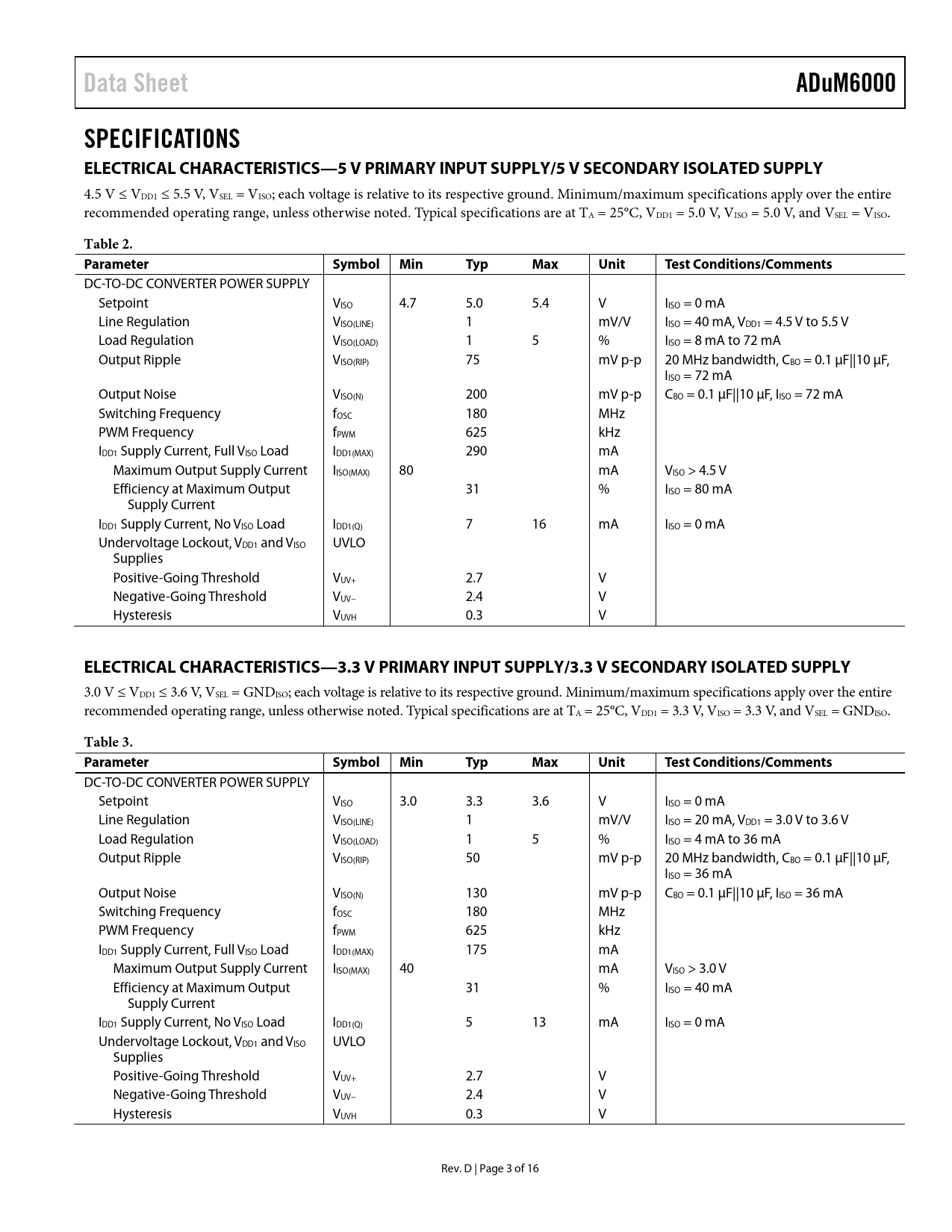 Data SheetADuM6000SPECIFICATIONS ELECTRICAL CHARACTERISTICS—5 V PRIMARY INPUT SUPPLY/5 V SECONDARY ISOLATED SUPPLY 4.5 V ≤ VDD1 ≤ 5.5 V, VSEL = VISO; each voltage is relative to its respective ground. Minimum/maximum specifications apply over the entire recommended operating range, unless otherwise noted. Typical specifications are at TA = 25°C, VDD1 = 5.0 V, VISO = 5.0 V, and VSEL = VISO. Table 2. ParameterSymbolMinTypMaxUnitTest Conditions/Comments DC-TO-DC CONVERTER POWER SUPPLY Setpoint VISO 4.7 5.0 5.4 V IISO = 0 mA Line Regulation VISO(LINE) 1 mV/V IISO = 40 mA, VDD1 = 4.5 V to 5.5 V Load Regulation VISO(LOAD) 1 5 % IISO = 8 mA to 72 mA Output Ripple VISO(RIP) 75 mV p-p 20 MHz bandwidth, CBO = 0.1 μF||10 μF, IISO = 72 mA Output Noise VISO(N) 200 mV p-p CBO = 0.1 μF||10 μF, IISO = 72 mA Switching Frequency fOSC 180 MHz PWM Frequency fPWM 625 kHz IDD1 Supply Current, Full VISO Load IDD1(MAX) 290 mA Maximum Output Supply Current IISO(MAX) 80 mA VISO > 4.5 V Efficiency at Maximum Output 31 % IISO = 80 mA Supply Current IDD1 Supply Current, No VISO Load IDD1(Q) 7 16 mA IISO = 0 mA Undervoltage Lockout, VDD1 and VISO UVLO Supplies Positive-Going Threshold VUV+ 2.7 V Negative-Going Threshold VUV− 2.4 V Hysteresis VUVH 0.3 V ELECTRICAL CHARACTERISTICS—3.3 V PRIMARY INPUT SUPPLY/3.3 V SECONDARY ISOLATED SUPPLY 3.0 V ≤ VDD1 ≤ 3.6 V, VSEL = GNDISO; each voltage is relative to its respective ground. Minimum/maximum specifications apply over the entire recommended operating range, unless otherwise noted. Typical specifications are at TA = 25°C, VDD1 = 3.3 V, VISO = 3.3 V, and VSEL = GNDISO. Table 3. ParameterSymbolMinTypMaxUnitTest Conditions/Comments DC-TO-DC CONVERTER POWER SUPPLY Setpoint VISO 3.0 3.3 3.6 V IISO = 0 mA Line Regulation VISO(LINE) 1 mV/V IISO = 20 mA, VDD1 = 3.0 V to 3.6 V Load Regulation VISO(LOAD) 1 5 % IISO = 4 mA to 36 mA Output Ripple VISO(RIP) 50 mV p-p 20 MHz bandwidth, CBO = 0.1 μF||10 μF, IISO = 36 mA Output Noise VISO(N) 130 mV p-p CBO = 0.1 μF||10 μF, IISO = 36 mA Switching Frequency fOSC 180 MHz PWM Frequency fPWM 625 kHz IDD1 Supply Current, Full VISO Load IDD1(MAX) 175 mA Maximum Output Supply Current IISO(MAX) 40 mA VISO > 3.0 V Efficiency at Maximum Output 31 % IISO = 40 mA Supply Current IDD1 Supply Current, No VISO Load IDD1(Q) 5 13 mA IISO = 0 mA Undervoltage Lockout, VDD1 and VISO UVLO Supplies Positive-Going Threshold VUV+ 2.7 V Negative-Going Threshold VUV− 2.4 V Hysteresis VUVH 0.3 V Rev. D | Page 3 of 16 Document Outline Features Applications General Description Functional Block Diagram Revision History Specifications Electrical Characteristics—5 V Primary Input Supply/5 V Secondary Isolated Supply Electrical Characteristics—3.3 V Primary Input Supply/3.3 V Secondary Isolated Supply Electrical Characteristics—5 V Primary Input Supply/3.3 V Secondary Isolated Supply Package Characteristics Regulatory Information Insulation and Safety-Related Specifications DIN V VDE V 0884-10 (VDE V 0884-10) and IEC 60747-5-2 (VDE 0884 Part 2):2003-01 Insulation Characteristics Thermal Derating Curve Recommended Operating Conditions Absolute Maximum Ratings ESD Caution Pin Configuration and Function Descriptions Typical Performance Characteristics Applications Information PCB Layout Start-Up Behavior EMI Considerations Thermal Analysis Current Limit and Thermal Overload Protection Power Considerations Increasing Available Power Insulation Lifetime Outline Dimensions Ordering Guide