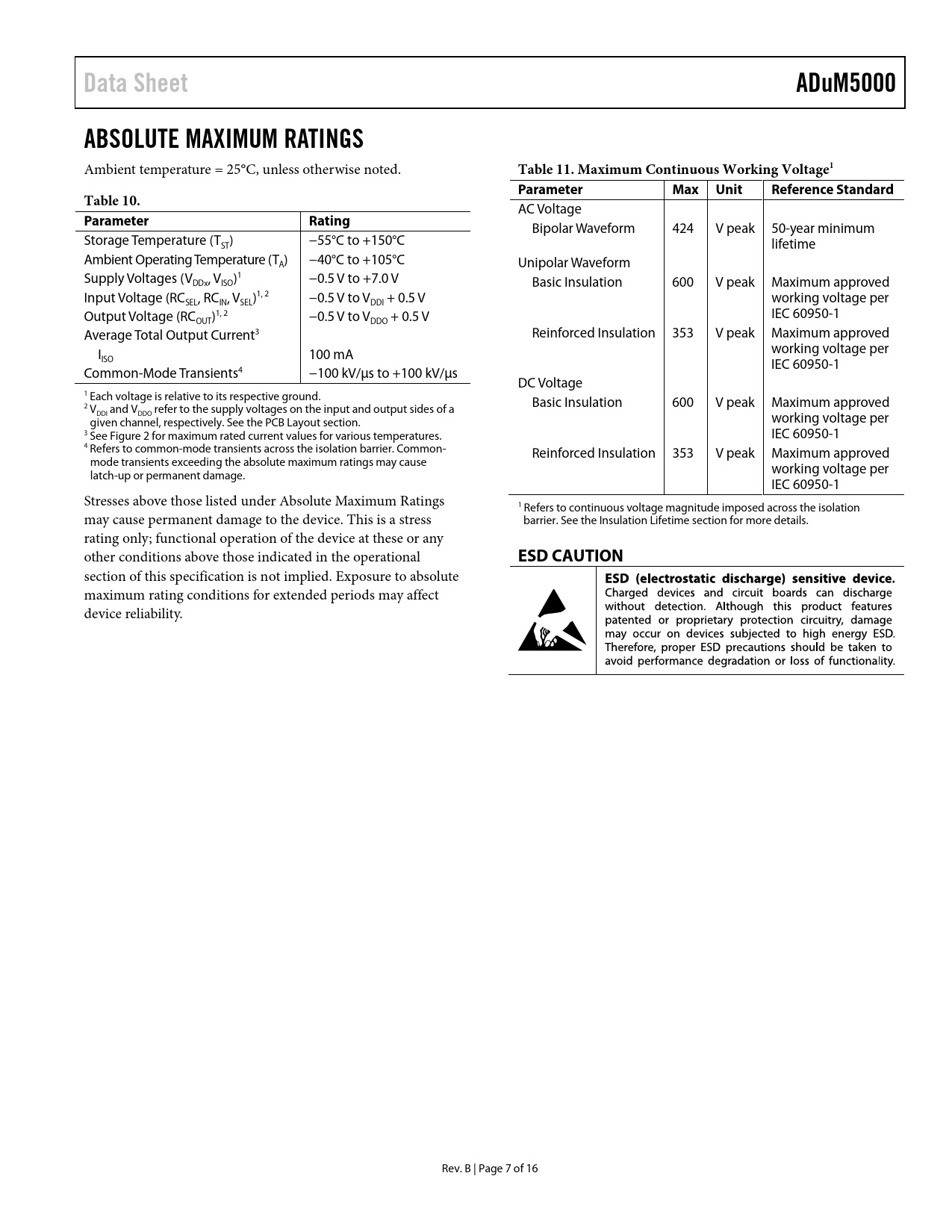 Data Sheet. ADuM5000. ABSOLUTE MAXIMUM RATINGS. Table 11. Maximum Continuous Working Voltage1. Parameter. Max Unit