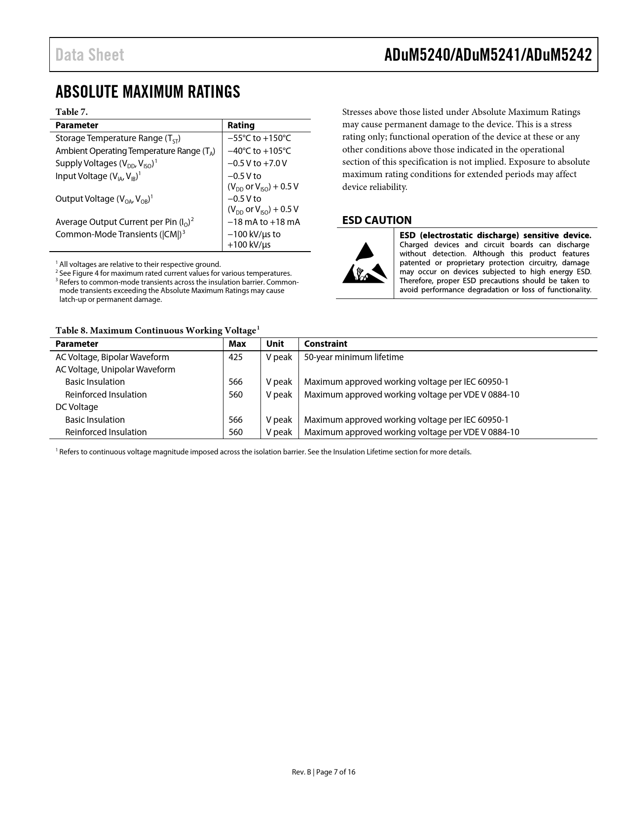 Data Sheet ADuM5240/ADuM5241/ADuM5242 ABSOLUTE MAXIMUM RATINGS Table 7 Parameter Rating ESD CAUTION