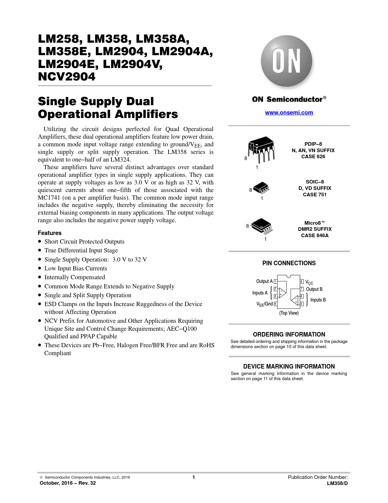 Datasheet LM258, LM358, LM358A, LM358E, LM2904, LM2904A, LM2904E, LM2904V, NCV2904 (ON Semiconductor)