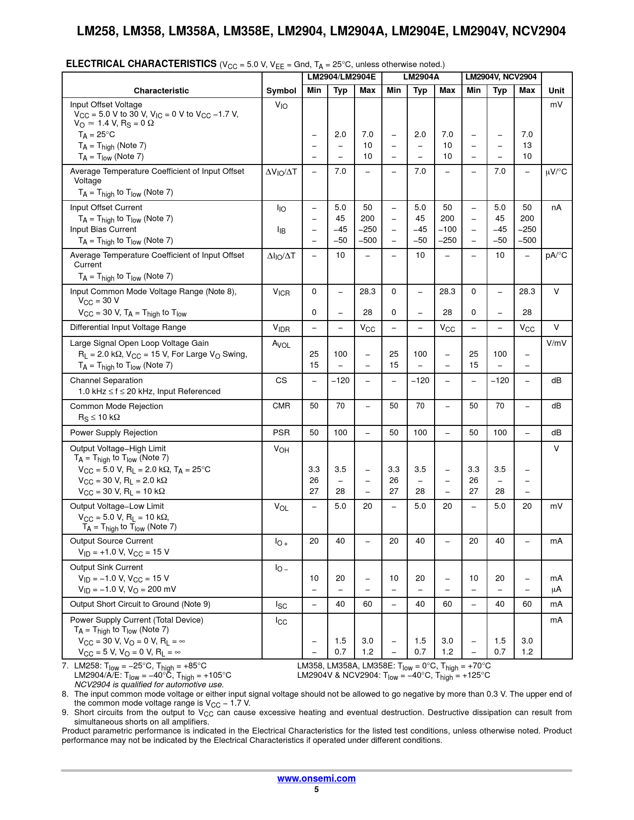 Datasheet LM258, LM358, LM358A, LM358E, LM2904, LM2904A, LM2904E, LM2904V, NCV2904 (ON Semiconductor) - 5