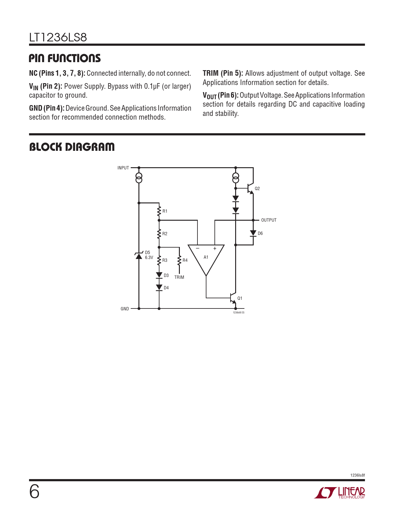 INPUT Q2 R1 OUTPUT R2 D6 – + D5 6.3V A1 R3 R4 D3 TRIM D4 Q1 GND 1236sl8 ES 1236ls8f 6 Document Outline Features Applications Description Typical Application Absolute Maximum Ratings Pin Configuration Order Information Electrical Characteristics Typical Performance Characteristics Pin Functions Block Diagram Applications Information Typical Applications Package Description Typical Application Related Parts
