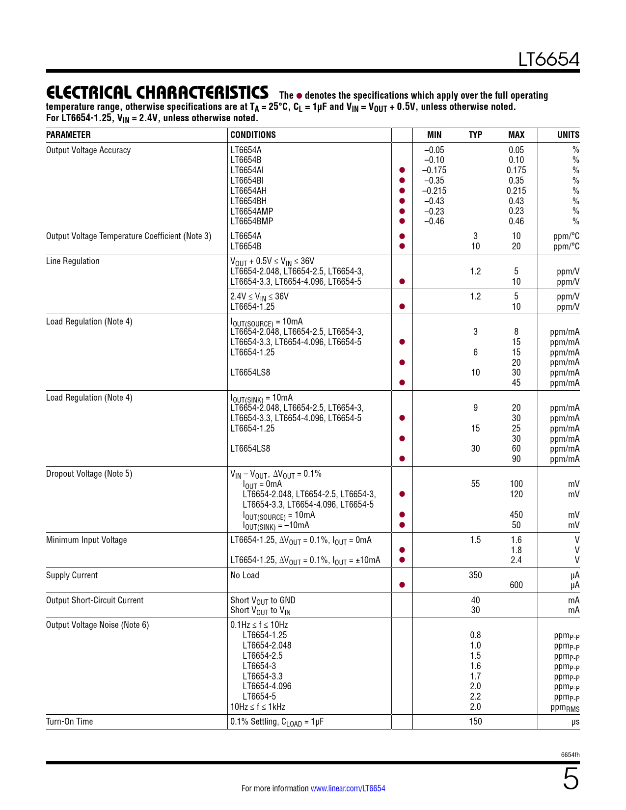 denotes the specifications which apply over the full operating temperature range, otherwise specifications are at TA = 25°C, CL = 1µF and VIN = VOUT + 0.5V, unless otherwise noted. For LT6654-1.25, VIN = 2.4V, unless otherwise noted. PARAMETER CONDITIONS MIN TYP MAX UNITS