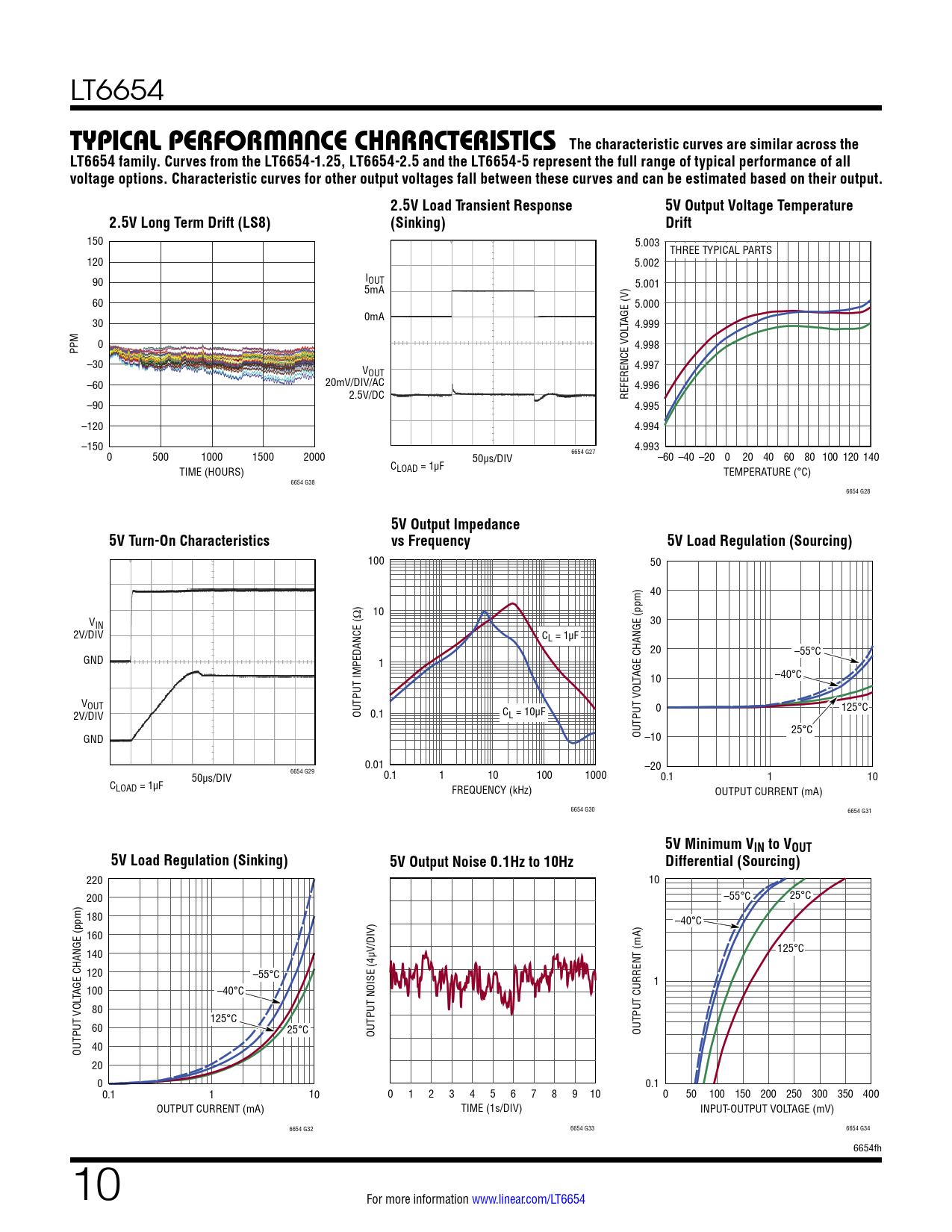Typical perForMance characTerisTics The characteristic curves are similar across the LT6654 family. Curves from the LT6654-1.25, LT6654-2.5 and the LT6654-5 represent the full range of typical performance of all voltage options. Characteristic curves for other output voltages fall between these curves and can be estimated based on their output. 2.5V Load Transient Response 5V Output Voltage Temperature 2.5V Long Term Drift (LS8) (Sinking) Drift
