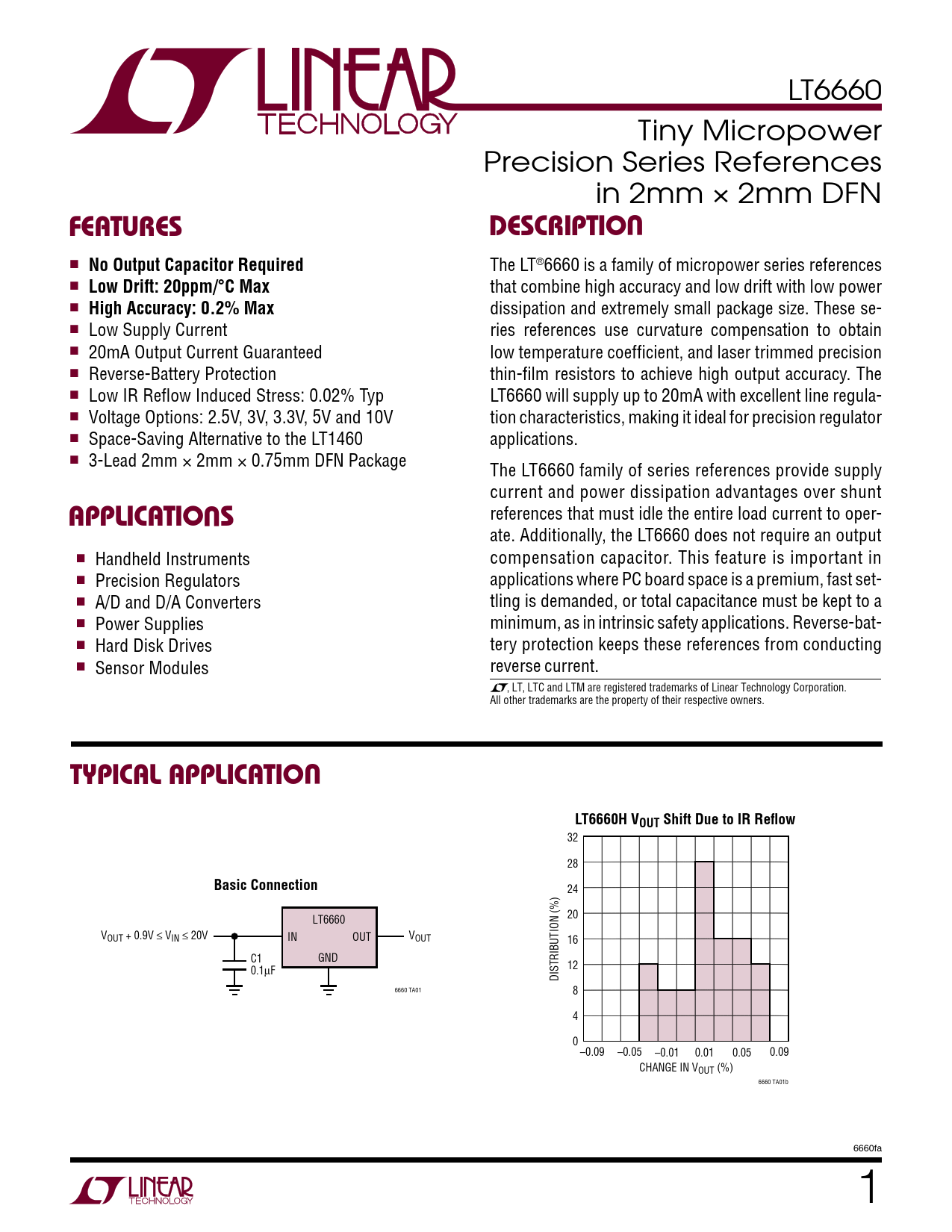 LT6660 Tiny Micropower Precision Series References in 2mm × 2mm DFN UFEATURESDESCRIPTIO ■ No Output Capacitor Required The LT®6660 is a family of micropower series references ■ Low Drift: 20ppm/°C Max that combine high accuracy and low drift with low power ■ High Accuracy: 0.2% Max dissipation and extremely small package size. These se- ■ Low Supply Current ries references use curvature compensation to obtain ■ 20mA Output Current Guaranteed low temperature coefficient, and laser trimmed precision ■ Reverse-Battery Protection thin-film resistors to achieve high output accuracy. The ■ Low IR Reflow Induced Stress: 0.02% Typ LT6660 will supply up to 20mA with excellent line regula- ■ Voltage Options: 2.5V, 3V, 3.3V, 5V and 10V tion characteristics, making it ideal for precision regulator ■ Space-Saving Alternative to the LT1460 applications. ■ 3-Lead 2mm × 2mm × 0.75mm DFN Package The LT6660 family of series references provide supply current and power dissipation advantages over shunt U references that must idle the entire load current to oper- APPLICATIO S ate. Additional y, the LT6660 does not require an output ■ Handheld Instruments compensation capacitor. This feature is important in ■ Precision Regulators applications where PC board space is a premium, fast set- ■ A/D and D/A Converters tling is demanded, or total capacitance must be kept to a ■ Power Supplies minimum, as in intrinsic safety applications. Reverse-bat- ■ Hard Disk Drives tery protection keeps these references from conducting ■ Sensor Modules reverse current. , LT, LTC and LTM are registered trademarks of Linear Technology Corporation. All other trademarks are the property of their respective owners. UTYPICAL APPLICATIOLT6660H VOUT Shift Due to IR Reflow 32 28 Basic Connection 24 20 LT6660 VOUT + 0.9V ≤ VIN ≤ 20V IN OUT VOUT 16 C1 GND 12 0.1µF DISTRIBUTION (%) 6660 TA01 8 4 0 –0.09 –0.05 –0.01 0.01 0.05 0.09 CHANGE IN VOUT (%) 6660 TA01b 6660fa 1