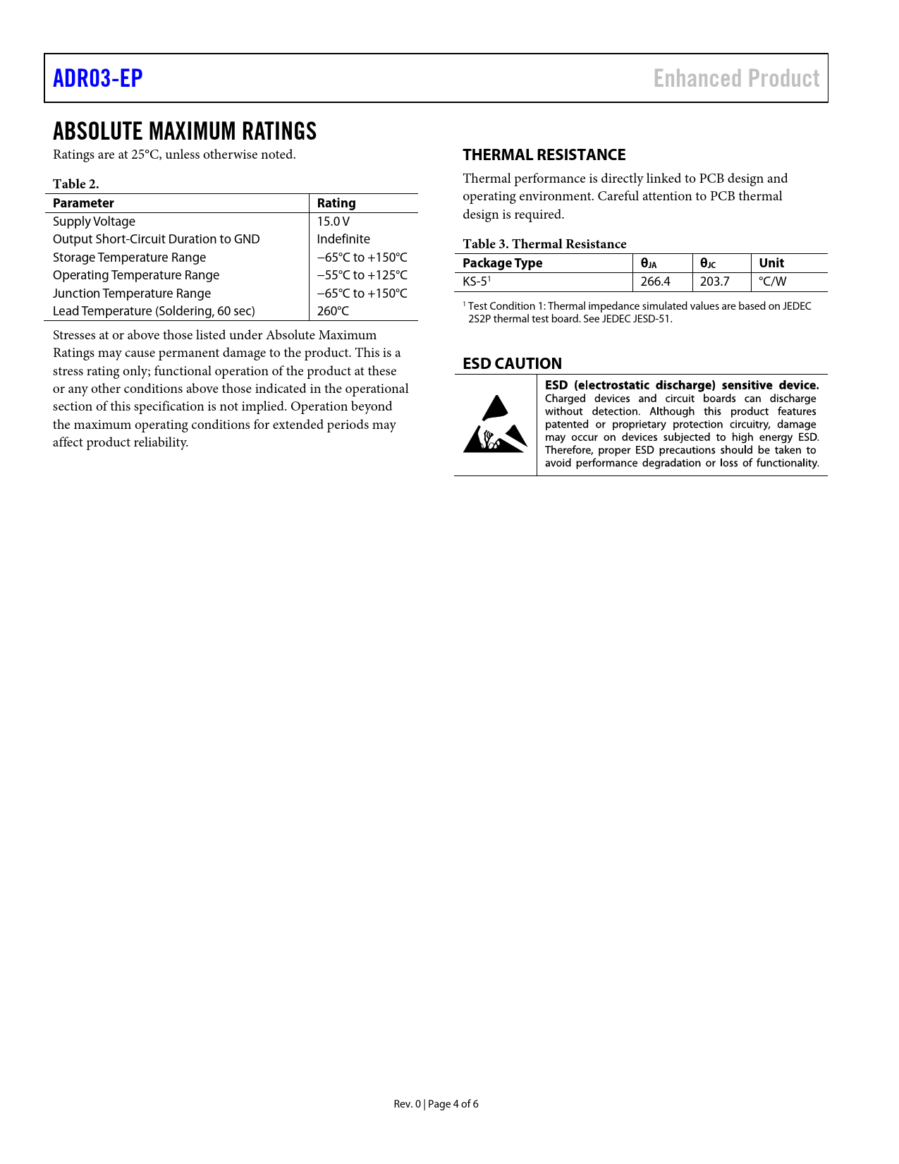 ADR03-EPEnhanced ProductABSOLUTE MAXIMUM RATINGS Ratings are at 25°C, unless otherwise noted. THERMAL RESISTANCETable 2. Thermal performance is directly linked to PCB design and ParameterRating operating environment. Careful attention to PCB thermal Supply Voltage 15.0 V design is required. Output Short-Circuit Duration to GND Indefinite Table 3. Thermal Resistance Storage Temperature Range −65°C to +150°C Package TypeθJAθJCUnit Operating Temperature Range −55°C to +125°C KS-51 266.4 203.7 °C/W Junction Temperature Range −65°C to +150°C Lead Temperature (Soldering, 60 sec) 260°C 1 Test Condition 1: Thermal impedance simulated values are based on JEDEC 2S2P thermal test board. See JEDEC JESD-51. Stresses at or above those listed under Absolute Maximum Ratings may cause permanent damage to the product. This is a stress rating only; functional operation of the product at these ESD CAUTION or any other conditions above those indicated in the operational section of this specification is not implied. Operation beyond the maximum operating conditions for extended periods may affect product reliability. Rev. 0 | Page 4 of 6 Document Outline FEATURES ENHANCED PRODUCT FEATURES APPLICATIONS PIN CONFIGURATION GENERAL DESCRIPTION TABLE OF CONTENTS REVISION HISTORY SPECIFICATIONS ELECTRICAL CHARACTERISTICS ABSOLUTE MAXIMUM RATINGS THERMAL RESISTANCE ESD CAUTION TYPICAL PERFORMANCE CHARACTERISTICS OUTLINE DIMENSIONS ORDERING GUIDE