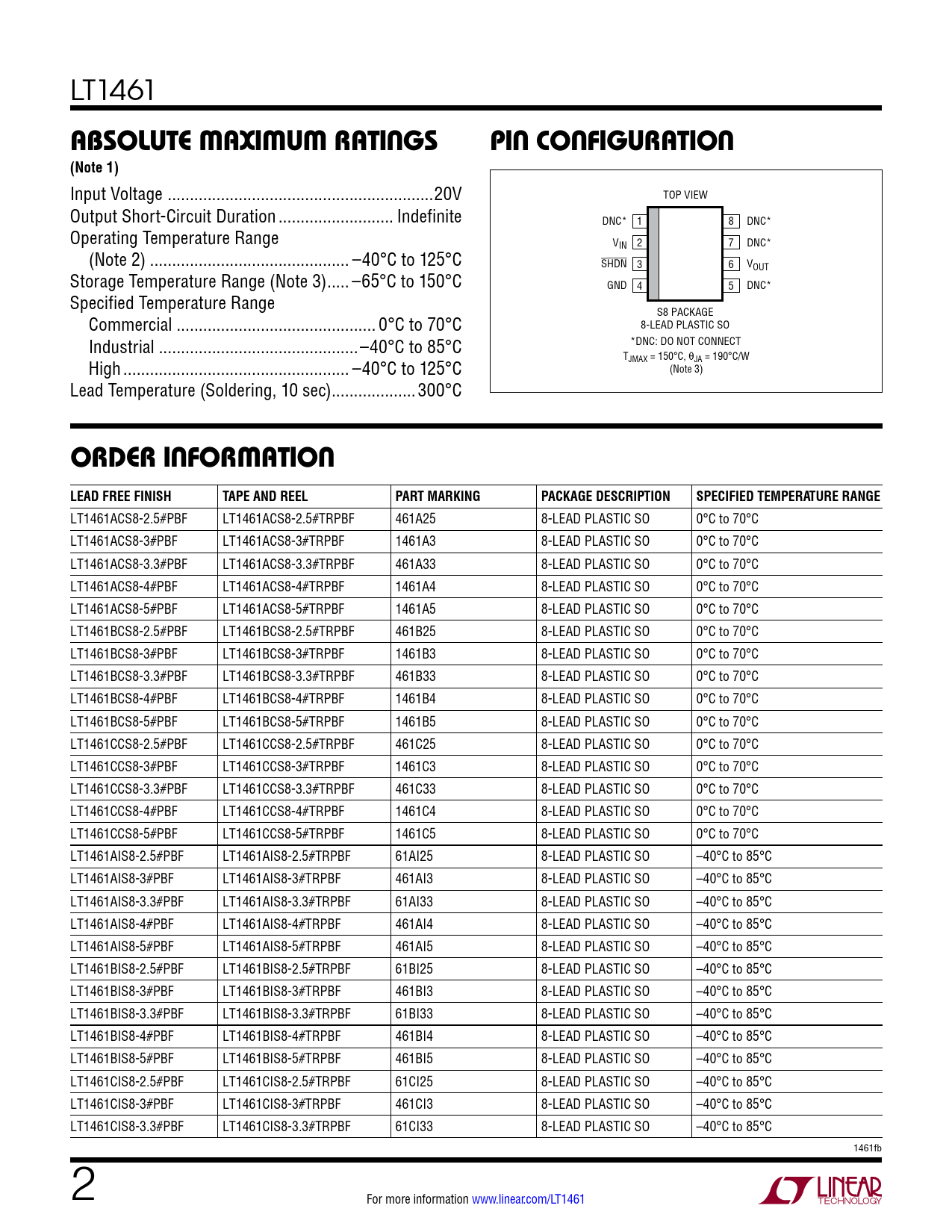 LT1461ACS8-2.5#PBF LT1461ACS8-2.5#TRPBF 461A25 8-LEAD PLASTIC SO 0°C to 70°C LT1461ACS8-3#PBF LT1461ACS8-3#TRPBF 1461A3 8-LEAD PLASTIC SO 0°C to 70°C LT1461ACS8-3.3#PBF LT1461ACS8-3.3#TRPBF 461A33 8-LEAD PLASTIC SO 0°C to 70°C LT1461ACS8-4#PBF LT1461ACS8-4#TRPBF 1461A4 8-LEAD PLASTIC SO 0°C to 70°C LT1461ACS8-5#PBF LT1461ACS8-5#TRPBF 1461A5 8-LEAD PLASTIC SO 0°C to 70°C LT1461BCS8-2.5#PBF LT1461BCS8-2.5#TRPBF 461B25 8-LEAD PLASTIC SO 0°C to 70°C LT1461BCS8-3#PBF LT1461BCS8-3#TRPBF 1461B3 8-LEAD PLASTIC SO 0°C to 70°C LT1461BCS8-3.3#PBF LT1461BCS8-3.3#TRPBF 461B33 8-LEAD PLASTIC SO 0°C to 70°C LT1461BCS8-4#PBF LT1461BCS8-4#TRPBF 1461B4 8-LEAD PLASTIC SO 0°C to 70°C LT1461BCS8-5#PBF LT1461BCS8-5#TRPBF 1461B5 8-LEAD PLASTIC SO 0°C to 70°C LT1461CCS8-2.5#PBF LT1461CCS8-2.5#TRPBF 461C25 8-LEAD PLASTIC SO 0°C to 70°C LT1461CCS8-3#PBF LT1461CCS8-3#TRPBF 1461C3 8-LEAD PLASTIC SO 0°C to 70°C LT1461CCS8-3.3#PBF LT1461CCS8-3.3#TRPBF 461C33 8-LEAD PLASTIC SO 0°C to 70°C LT1461CCS8-4#PBF LT1461CCS8-4#TRPBF 1461C4 8-LEAD PLASTIC SO 0°C to 70°C LT1461CCS8-5#PBF LT1461CCS8-5#TRPBF 1461C5 8-LEAD PLASTIC SO 0°C to 70°C LT1461AIS8-2.5#PBF LT1461AIS8-2.5#TRPBF 61AI25 8-LEAD PLASTIC SO –40°C to 85°C LT1461AIS8-3#PBF LT1461AIS8-3#TRPBF 461AI3 8-LEAD PLASTIC SO –40°C to 85°C LT1461AIS8-3.3#PBF LT1461AIS8-3.3#TRPBF 61AI33 8-LEAD PLASTIC SO –40°C to 85°C LT1461AIS8-4#PBF LT1461AIS8-4#TRPBF 461AI4 8-LEAD PLASTIC SO –40°C to 85°C LT1461AIS8-5#PBF LT1461AIS8-5#TRPBF 461AI5 8-LEAD PLASTIC SO –40°C to 85°C LT1461BIS8-2.5#PBF LT1461BIS8-2.5#TRPBF 61BI25 8-LEAD PLASTIC SO –40°C to 85°C LT1461BIS8-3#PBF LT1461BIS8-3#TRPBF 461BI3 8-LEAD PLASTIC SO –40°C to 85°C LT1461BIS8-3.3#PBF LT1461BIS8-3.3#TRPBF 61BI33 8-LEAD PLASTIC SO –40°C to 85°C LT1461BIS8-4#PBF LT1461BIS8-4#TRPBF 461BI4 8-LEAD PLASTIC SO –40°C to 85°C LT1461BIS8-5#PBF LT1461BIS8-5#TRPBF 461BI5 8-LEAD PLASTIC SO –40°C to 85°C LT1461CIS8-2.5#PBF LT1461CIS8-2.5#TRPBF 61CI25 8-LEAD PLASTIC SO –40°C to 85°C LT1461CIS8-3#PBF LT1461CIS8-3#TRPBF 461CI3 8-LEAD PLASTIC SO –40°C to 85°C LT1461CIS8-3.3#PBF LT1461CIS8-3.3#TRPBF 61CI33 8-LEAD PLASTIC SO –40°C to 85°C 1461fb 2 For more information www.linear.com/LT1461 Document Outline Features Applications Typical Application Description Absolute Maximum Ratings Order Information Pin Configuration Available Options Electrical Characteristics Applications Information Simplified Schematic Package Description Revision History Typical Application Related Parts