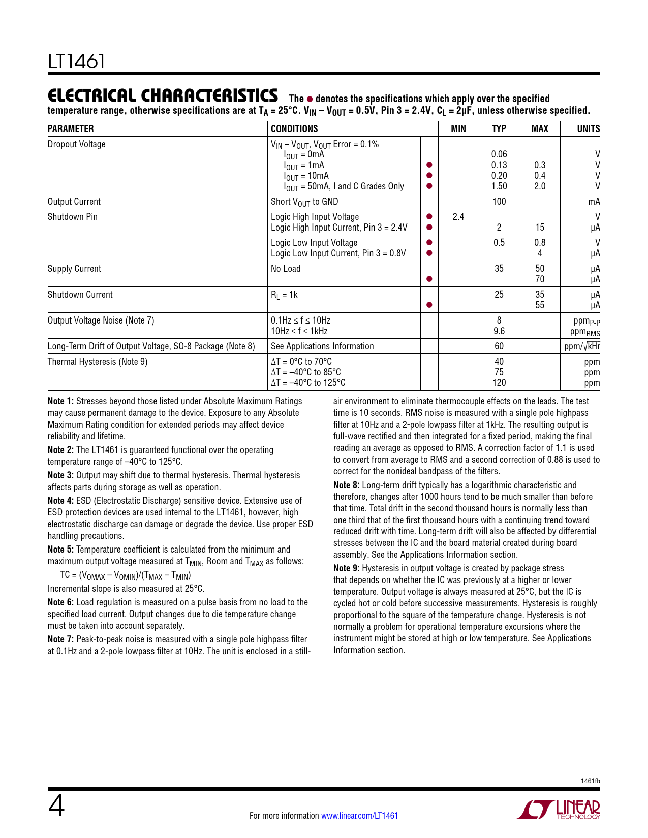 Dropout Voltage VIN – VOUT, VOUT Error = 0.1% IOUT = 0mA 0.06 V IOUT = 1mA l 0.13 0.3 V IOUT = 10mA l 0.20 0.4 V IOUT = 50mA, I and C Grades Only l 1.50 2.0 V Output Current Short VOUT to GND 100 mA Shutdown Pin Logic High Input Voltage l 2.4 V Logic High Input Current, Pin 3 = 2.4V l 2 15 µA Logic Low Input Voltage l 0.5 0.8 V Logic Low Input Current, Pin 3 = 0.8V l 4 µA Supply Current No Load 35 50 µA l 70 µA Shutdown Current RL = 1k 25 35 µA l 55 µA Output Voltage Noise (Note 7) 0.1Hz ≤ f ≤ 10Hz 8 ppmP-P 10Hz ≤ f ≤ 1kHz 9.6 ppmRMS Long-Term Drift of Output Voltage, SO-8 Package (Note 8) See Applications Information 60 ppm/√kHr Thermal Hysteresis (Note 9) ∆T = 0°C to 70°C 40 ppm ∆T = –40°C to 85°C 75 ppm ∆T = –40°C to 125°C 120 ppm