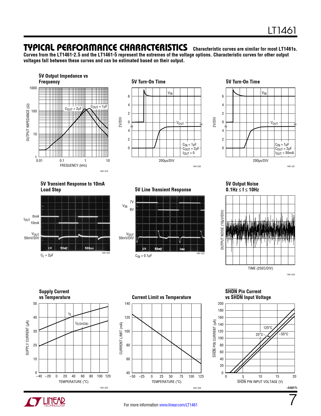 Typical perForMance characTerisTics Characteristic curves are similar for most LT1461s. Curves from the LT1461-2.5 and the LT1461-5 represent the extremes of the voltage options. Characteristic curves for other output voltages fall between these curves and can be estimated based on their output. 5V Output Impedance vs Frequency 5V Turn-On Time 5V Turn-On Time