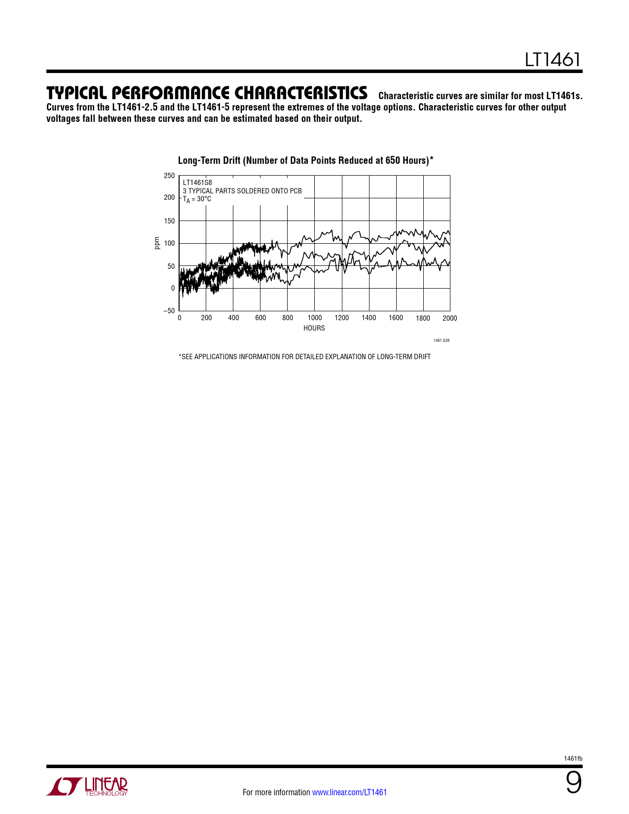 Typical perForMance characTerisTics Characteristic curves are similar for most LT1461s. Curves from the LT1461-2.5 and the LT1461-5 represent the extremes of the voltage options. Characteristic curves for other output voltages fall between these curves and can be estimated based on their output. Long-Term Drift (Number of Data Points Reduced at 650 Hours)*