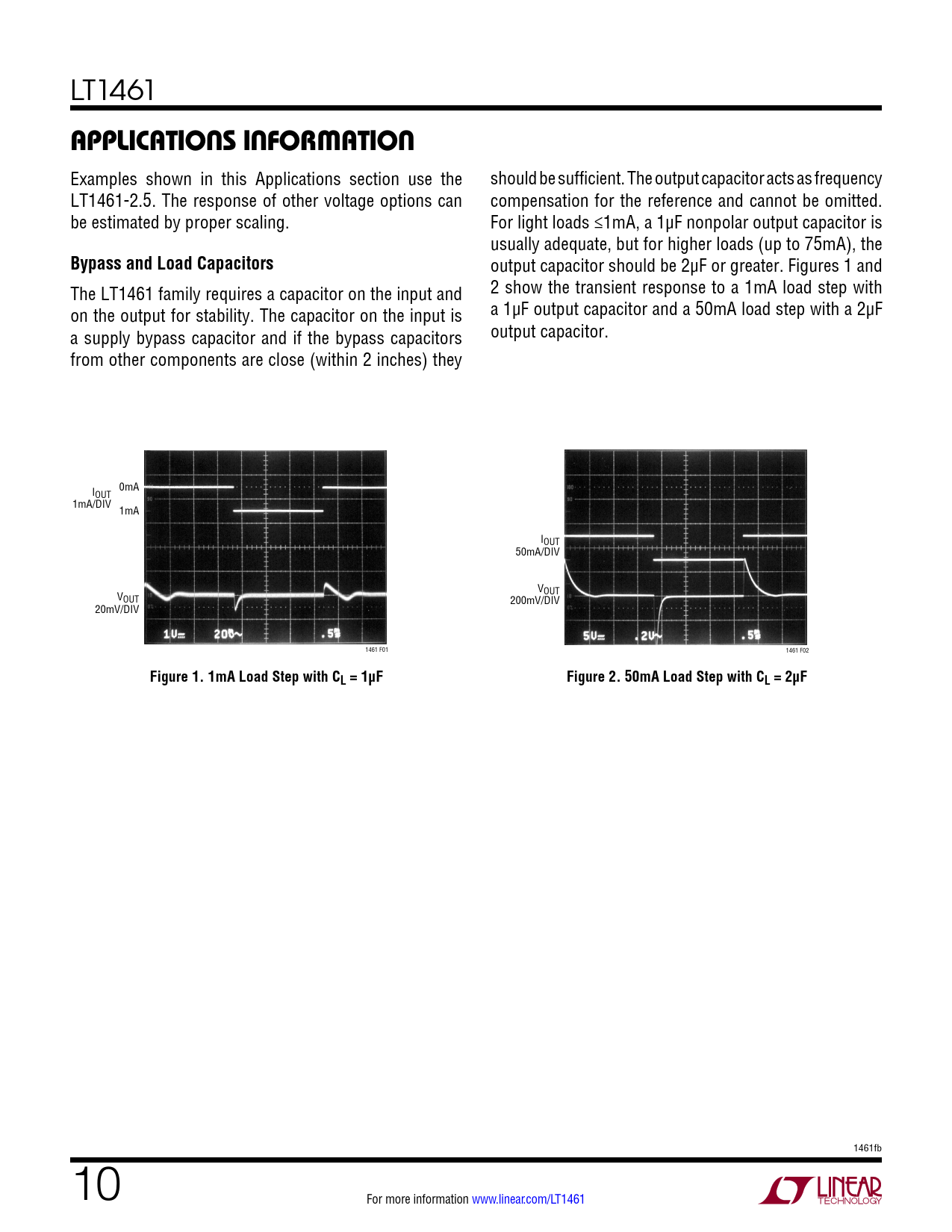 LT1461 applicaTions inForMaTion Examples shown in this Applications section use the should be sufficient. The output capacitor acts as frequency LT1461-2.5. The response of other voltage options can compensation for the reference and cannot be omitted. be estimated by proper scaling. For light loads ≤1mA, a 1µF nonpolar output capacitor is usually adequate, but for higher loads (up to 75mA), the Bypass and Load Capacitors output capacitor should be 2µF or greater. Figures 1 and The LT1461 family requires a capacitor on the input and 2 show the transient response to a 1mA load step with on the output for stability. The capacitor on the input is a 1µF output capacitor and a 50mA load step with a 2µF a supply bypass capacitor and if the bypass capacitors output capacitor. from other components are close (within 2 inches) they 0mA IOUT 1mA/DIV 1mA IOUT 50mA/DIV V V OUT OUT 200mV/DIV 20mV/DIV 1461 F01 1461 F02 Figure 1. 1mA Load Step with CL = 1µFFigure 2. 50mA Load Step with CL = 2µF 1461fb 10 For more information www.linear.com/LT1461 Document Outline Features Applications Typical Application Description Absolute Maximum Ratings Order Information Pin Configuration Available Options Electrical Characteristics Applications Information Simplified Schematic Package Description Revision History Typical Application Related Parts