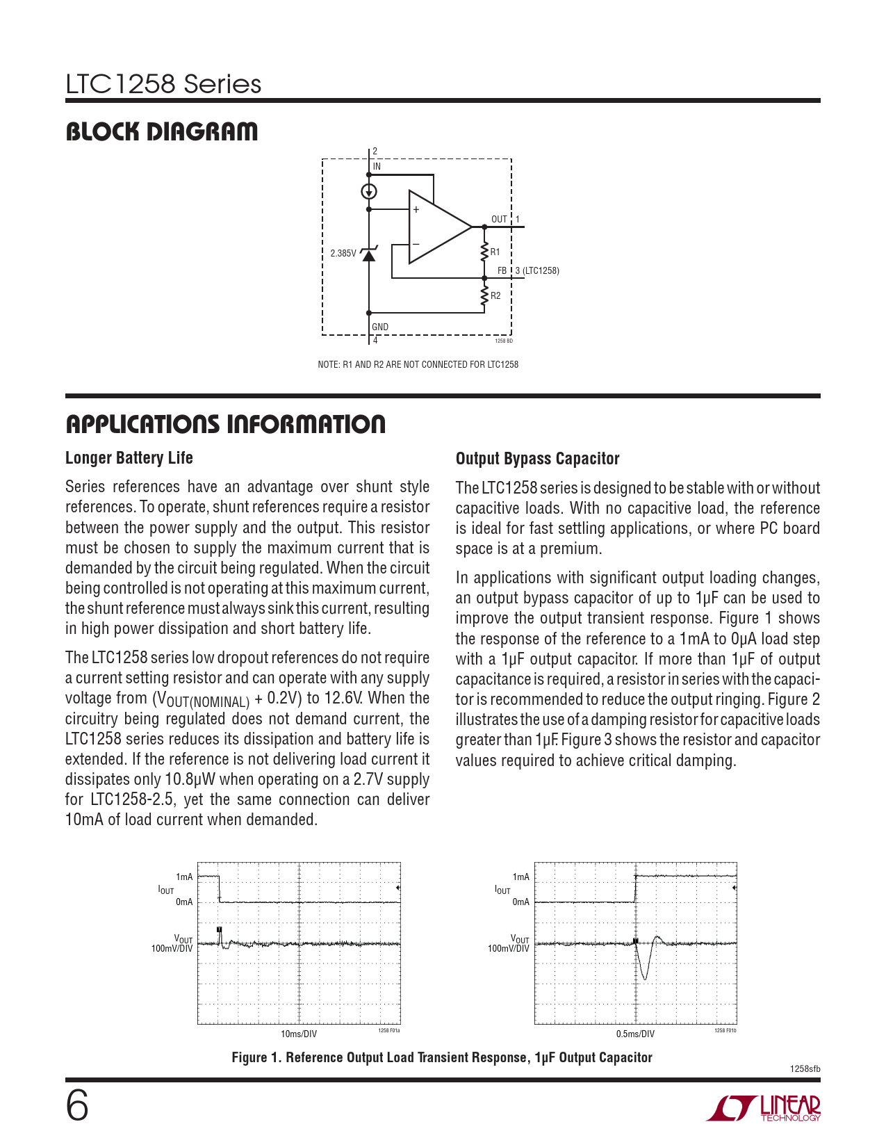 LTC1258 Series BLOCK DIAGRAM 2 IN + OUT 1 – 2.385V R1 FB 3 (LTC1258) R2 GND 4 1258 BD NOTE: R1 AND R2 ARE NOT CONNECTED FOR LTC1258 APPLICATIONS INFORMATION Longer Battery LifeOutput Bypass Capacitor Series references have an advantage over shunt style The LTC1258 series is designed to be stable with or without references. To operate, shunt references require a resistor capacitive loads. With no capacitive load, the reference between the power supply and the output. This resistor is ideal for fast settling applications, or where PC board must be chosen to supply the maximum current that is space is at a premium. demanded by the circuit being regulated. When the circuit In applications with signifi cant output loading changes, being controlled is not operating at this maximum current, an output bypass capacitor of up to 1μF can be used to the shunt reference must always sink this current, resulting improve the output transient response. Figure 1 shows in high power dissipation and short battery life. the response of the reference to a 1mA to 0μA load step The LTC1258 series low dropout references do not require with a 1μF output capacitor. If more than 1μF of output a current setting resistor and can operate with any supply capacitance is required, a resistor in series with the capaci- voltage from (VOUT(NOMINAL) + 0.2V) to 12.6V. When the tor is recommended to reduce the output ringing. Figure 2 circuitry being regulated does not demand current, the illustrates the use of a damping resistor for capacitive loads LTC1258 series reduces its dissipation and battery life is greater than 1μF. Figure 3 shows the resistor and capacitor extended. If the reference is not delivering load current it values required to achieve critical damping. dissipates only 10.8μW when operating on a 2.7V supply for LTC1258-2.5, yet the same connection can deliver 10mA of load current when demanded. 1mA 1mA IOUT IOUT 0mA 0mA VOUT VOUT 100mV/DIV 100mV/DIV 10ms/DIV 1258 F01a 0.5ms/DIV 1258 F01b Figure 1. Reference Output Load Transient Response, 1μF Output Capacitor 1258sfb 6