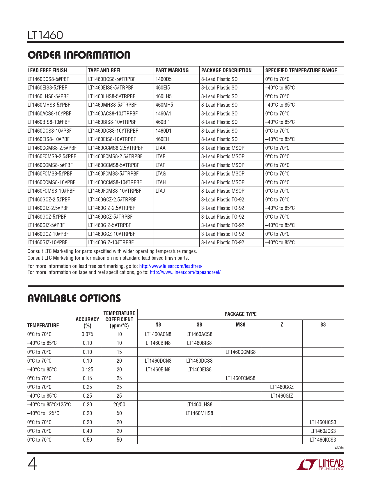 LT1460DCS8-5#PBF LT1460DCS8-5#TRPBF 1460D5 8-Lead Plastic SO 0°C to 70°C LT1460EIS8-5#PBF LT1460EIS8-5#TRPBF 460EI5 8-Lead Plastic SO –40°C to 85°C LT1460LHS8-5#PBF LT1460LHS8-5#TRPBF 460LH5 8-Lead Plastic SO 0°C to 70°C LT1460MHS8-5#PBF LT1460MHS8-5#TRPBF 460MH5 8-Lead Plastic SO –40°C to 85°C LT1460ACS8-10#PBF LT1460ACS8-10#TRPBF 1460A1 8-Lead Plastic SO 0°C to 70°C LT1460BIS8-10#PBF LT1460BIS8-10#TRPBF 460BI1 8-Lead Plastic SO –40°C to 85°C LT1460DCS8-10#PBF LT1460DCS8-10#TRPBF 1460D1 8-Lead Plastic SO 0°C to 70°C LT1460EIS8-10#PBF LT1460EIS8-10#TRPBF 460EI1 8-Lead Plastic SO –40°C to 85°C LT1460CCMS8-2.5#PBF LT1460CCMS8-2.5#TRPBF LTAA 8-Lead Plastic MSOP 0°C to 70°C LT1460FCMS8-2.5#PBF LT1460FCMS8-2.5#TRPBF LTAB 8-Lead Plastic MSOP 0°C to 70°C LT1460CCMS8-5#PBF LT1460CCMS8-5#TRPBF LTAF 8-Lead Plastic MSOP 0°C to 70°C LT1460FCMS8-5#PBF LT1460FCMS8-5#TRPBF LTAG 8-Lead Plastic MSOP 0°C to 70°C LT1460CCMS8-10#PBF LT1460CCMS8-10#TRPBF LTAH 8-Lead Plastic MSOP 0°C to 70°C LT1460FCMS8-10#PBF LT1460FCMS8-10#TRPBF LTAJ 8-Lead Plastic MSOP 0°C to 70°C LT1460GCZ-2.5#PBF LT1460GCZ-2.5#TRPBF 3-Lead Plastic TO-92 0°C to 70°C LT1460GIZ-2.5#PBF LT1460GIZ-2.5#TRPBF 3-Lead Plastic TO-92 –40°C to 85°C LT1460GCZ-5#PBF LT1460GCZ-5#TRPBF 3-Lead Plastic TO-92 0°C to 70°C LT1460GIZ-5#PBF LT1460GIZ-5#TRPBF 3-Lead Plastic TO-92 –40°C to 85°C LT1460GCZ-10#PBF LT1460GCZ-10#TRPBF 3-Lead Plastic TO-92 0°C to 70°C LT1460GIZ-10#PBF LT1460GIZ-10#TRPBF 3-Lead Plastic TO-92 –40°C to 85°C Consult LTC Marketing for parts specified with wider operating temperature ranges. Consult LTC Marketing for information on non-standard lead based finish parts. For more information on lead free part marking, go to: http://www.linear.com/leadfree/ For more information on tape and reel specifications, go to: http://www.linear.com/tapeandreel/ available options