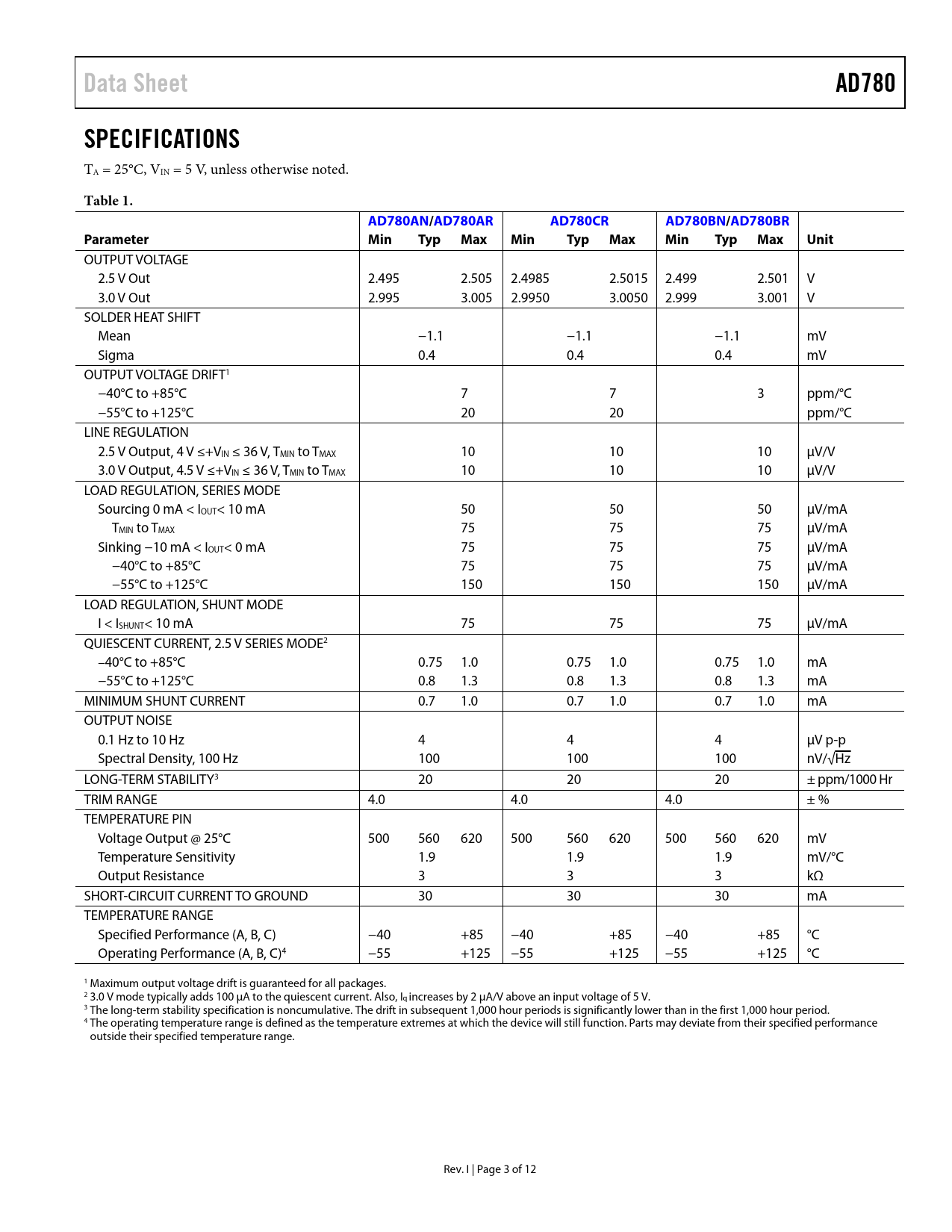 Seiten / Seite12 / 3 — Data Sheet. AD780. SPECIFICATIONS. Table 1. AD780AN/AD780AR. AD780CR …
