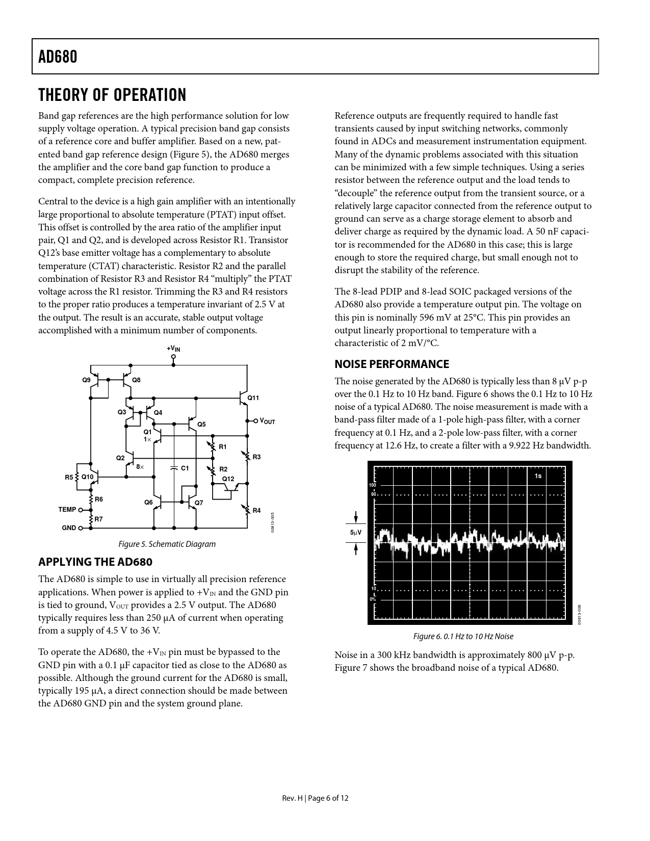 link to page 6 link to page 6 link to page 7 AD680THEORY OF OPERATION Band gap references are the high performance solution for low Reference outputs are frequently required to handle fast supply voltage operation. A typical precision band gap consists transients caused by input switching networks, commonly of a reference core and buffer amplifier. Based on a new, pat- found in ADCs and measurement instrumentation equipment. ented band gap reference design (Figure 5), the AD680 merges Many of the dynamic problems associated with this situation the amplifier and the core band gap function to produce a can be minimized with a few simple techniques. Using a series compact, complete precision reference. resistor between the reference output and the load tends to “decouple” the reference output from the transient source, or a Central to the device is a high gain amplifier with an intentionally relatively large capacitor connected from the reference output to large proportional to absolute temperature (PTAT) input offset. ground can serve as a charge storage element to absorb and This offset is controlled by the area ratio of the amplifier input deliver charge as required by the dynamic load. A 50 nF capaci- pair, Q1 and Q2, and is developed across Resistor R1. Transistor tor is recommended for the AD680 in this case; this is large Q12’s base emitter voltage has a complementary to absolute enough to store the required charge, but small enough not to temperature (CTAT) characteristic. Resistor R2 and the parallel disrupt the stability of the reference. combination of Resistor R3 and Resistor R4 “multiply” the PTAT voltage across the R1 resistor. Trimming the R3 and R4 resistors The 8-lead PDIP and 8-lead SOIC packaged versions of the to the proper ratio produces a temperature invariant of 2.5 V at AD680 also provide a temperature output pin. The voltage on the output. The result is an accurate, stable output voltage this pin is nominally 596 mV at 25°C. This pin provides an accomplished with a minimum number of components. output linearly proportional to temperature with a characteristic of 2 mV/°C. +VINNOISE PERFORMANCEQ9Q8 The noise generated by the AD680 is typically less than 8 μV p-p over the 0.1 Hz to 10 Hz band. Figure 6 shows the 0.1 Hz to 10 Hz Q11 noise of a typical AD680. The noise measurement is made with a Q3Q4V band-pass filter made of a 1-pole high-pass filter, with a corner Q5OUTQ1 frequency at 0.1 Hz, and a 2-pole low-pass filter, with a corner 1 × R1 frequency at 12.6 Hz, to create a filter with a 9.922 Hz bandwidth. Q2R38 × C1R2R5Q101sQ1210090R6Q6Q7TEMPR4R7GND 00813-005 5 μ V Figure 5. Schematic Diagram APPLYING THE AD680 The AD680 is simple to use in virtually all precision reference applications. When power is applied to +V 10 IN and the GND pin 0% is tied to ground, VOUT provides a 2.5 V output. The AD680 typically requires less than 250 μA of current when operating 00813-006 from a supply of 4.5 V to 36 V. Figure 6. 0.1 Hz to 10 Hz Noise To operate the AD680, the +VIN pin must be bypassed to the Noise in a 300 kHz bandwidth is approximately 800 μV p-p. GND pin with a 0.1 μF capacitor tied as close to the AD680 as Figure 7 shows the broadband noise of a typical AD680. possible. Although the ground current for the AD680 is small, typically 195 μA, a direct connection should be made between the AD680 GND pin and the system ground plane. Rev. H | Page 6 of 12 Document Outline FEATURES GENERAL DESCRIPTION CONNECTION DIAGRAMS PRODUCT HIGHLIGHTS SPECIFICATIONS ABSOLUTE MAXIMUM RATINGS OUTPUT PROTECTION ESD CAUTION PIN CONFIGURATIONS AND FUNCTION DESCRIPTIONS THEORY OF OPERATION APPLYING THE AD680 NOISE PERFORMANCE TURN-ON TIME DYNAMIC PERFORMANCE LOAD REGULATION TEMPERATURE PERFORMANCE TEMPERATURE OUTPUT PIN DIFFERENTIAL TEMPERATURE TRANSDUCER LOW POWER, LOW VOLTAGE REFERENCE FOR DATA CONVERTERS 4.5 V REFERENCE FROM A 5 V SUPPLY VOLTAGE REGULATOR FOR PORTABLE EQUIPMENT OUTLINE DIMENSIONS ORDERING GUIDE