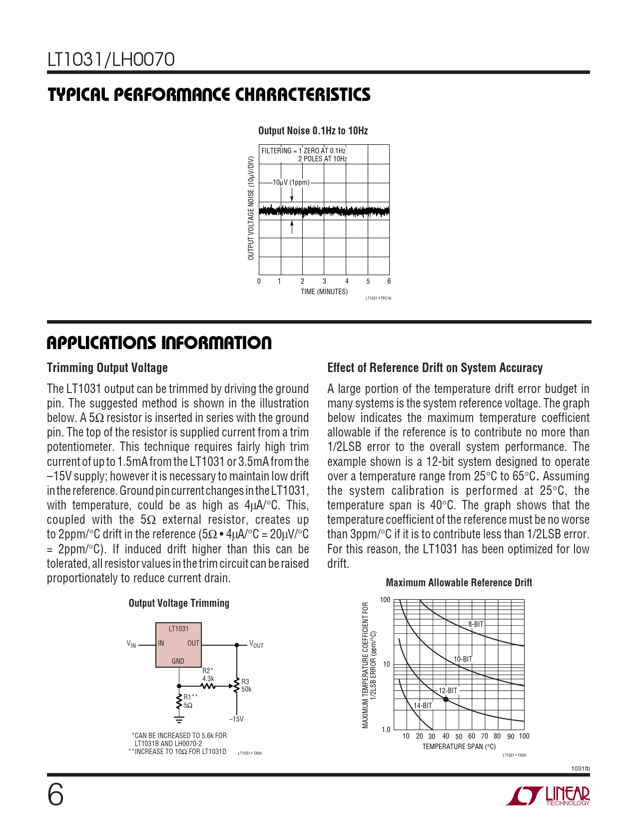 LT1031/LH0070 WUTYPICAL PERFOR A CE CHARACTERISTICSOutput Noise 0.1Hz to 10Hz FILTERING = 1 ZERO AT 0.1Hz 2 POLES AT 10Hz µV/DIV) 10µV (1ppm) OUTPUT VOLTAGE NOISE (10 0 1 2 3 4 5 6 TIME (MINUTES) LT1031 • TPC16 UUWUAPPLICATIO S I FOR ATIOTrimming Output VoltageEffect of Reference Drift on System Accuracy The LT1031 output can be trimmed by driving the ground A large portion of the temperature drift error budget in pin. The suggested method is shown in the illustration many systems is the system reference voltage. The graph below. A 5Ω resistor is inserted in series with the ground below indicates the maximum temperature coefficient pin. The top of the resistor is supplied current from a trim allowable if the reference is to contribute no more than potentiometer. This technique requires fairly high trim 1/2LSB error to the overall system performance. The current of up to 1.5mA from the LT1031 or 3.5mA from the example shown is a 12-bit system designed to operate –15V supply; however it is necessary to maintain low drift over a temperature range from 25°C to 65°C . Assuming in the reference. Ground pin current changes in the LT1031, the system calibration is performed at 25°C, the with temperature, could be as high as 4µA/°C. This, temperature span is 40°C. The graph shows that the coupled with the 5Ω external resistor, creates up temperature coefficient of the reference must be no worse to 2ppm/°C drift in the reference (5Ω • 4µA/°C = 20µV/°C than 3ppm/°C if it is to contribute less than 1/2LSB error. = 2ppm/°C). If induced drift higher than this can be For this reason, the LT1031 has been optimized for low tolerated, all resistor values in the trim circuit can be raised drift. proportionately to reduce current drain. Maximum Allowable Reference DriftOutput Voltage Trimming 100 8-BIT LT1031 °C) VIN IN OUT VOUT GND 10-BIT 10 R2* 4.3k R3 50k 12-BIT R1** 1/2LSB ERROR (ppm/ 5Ω 14-BIT –15V MAXIMUM TEMPERATURE COEFFICIENT FOR 1.0 *CAN BE INCREASED TO 5.6k FOR 10 20 30 40 50 60 70 80 90 100 LT1031B AND LH0070-2 TEMPERATURE SPAN (°C) **INCREASE TO 10Ω FOR LT1031D LT1031 • TA04 LT1031 • TA03 1031fb 6