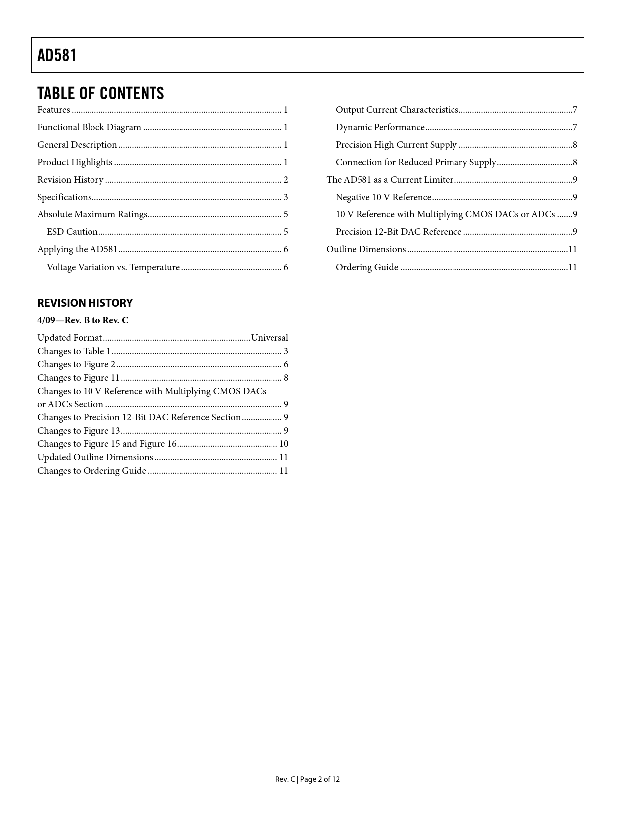 Seiten / Seite12 / 2 — AD581. TABLE OF CONTENTS. REVISION HISTORY. 4/09—Rev. B to Rev. C