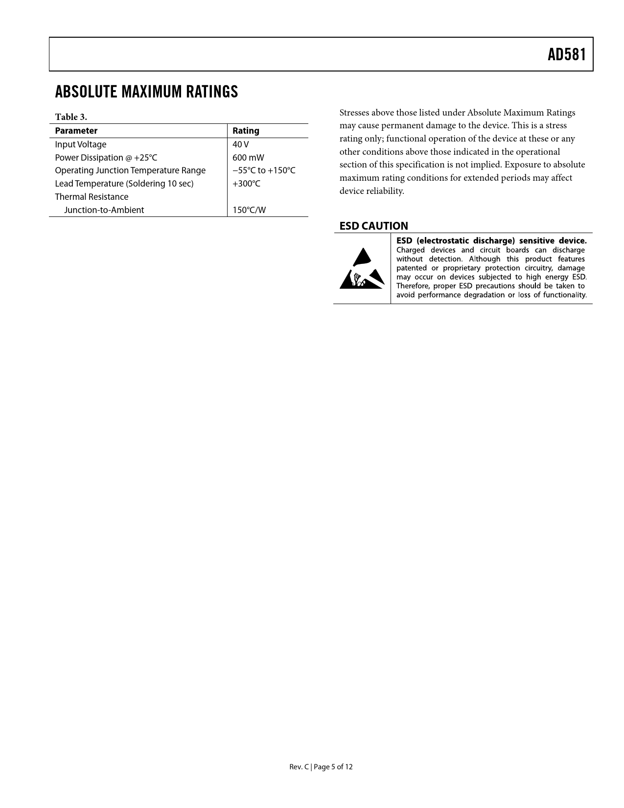 AD581ABSOLUTE MAXIMUM RATINGSTable 3. Stresses above those listed under Absolute Maximum Ratings may cause permanent damage to the device. This is a stress Parameter Rating rating only; functional operation of the device at these or any Input Voltage 40 V other conditions above those indicated in the operational Power Dissipation @ +25°C 600 mW section of this specification is not implied. Exposure to absolute Operating Junction Temperature Range −55°C to +150°C maximum rating conditions for extended periods may affect Lead Temperature (Soldering 10 sec) +300°C device reliability. Thermal Resistance Junction-to-Ambient 150°C/W ESD CAUTION Rev. C | Page 5 of 12 Document Outline FEATURES FUNCTIONAL BLOCK DIAGRAM GENERAL DESCRIPTION PRODUCT HIGHLIGHTS TABLE OF CONTENTS REVISION HISTORY SPECIFICATIONS ABSOLUTE MAXIMUM RATINGS ESD CAUTION APPLYING THE AD581 VOLTAGE VARIATION vs. TEMPERATURE OUTPUT CURRENT CHARACTERISTICS DYNAMIC PERFORMANCE PRECISION HIGH CURRENT SUPPLY CONNECTION FOR REDUCED PRIMARY SUPPLY THE AD581 AS A CURRENT LIMITER NEGATIVE 10 V REFERENCE 10 V REFERENCE WITH MULTIPLYING CMOS DACs OR ADCs PRECISION 12-BIT DAC REFERENCE OUTLINE DIMENSIONS ORDERING GUIDE