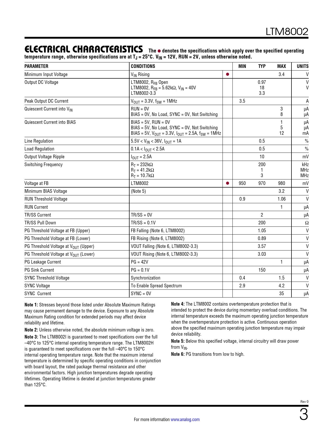 LTM8002 ELECTRICAL CHARACTERISTICSThe l denotes the specifications which apply over the specified operatingtemperature range, otherwise specifications are at TJ = 25°C. VIN = 12V, RUN = 2V, unless otherwise noted. PARAMETERCONDITIONSMINTYPMAXUNITS Minimum Input Voltage VIN Rising l 3.4 V Output DC Voltage LTM8002, RFB Open 0.97 V LTM8002, RFB = 5.62kΩ, VIN = 40V 18 V LTM8002-3.3 3.3 Peak Output DC Current VOUT = 3.3V, fSW = 1MHz 3.5 A Quiescent Current into VIN RUN = 0V 3 µA BIAS = 0V, No Load, SYNC = 0V, Not Switching 8 µA Quiescent Current into BIAS BIAS = 5V, RUN = 0V 1 µA BIAS = 5V, No Load, SYNC = 0V, Not Switching 5 µA BIAS = 5V, VOUT = 3.3V, IOUT = 2.5A, fSW = 1MHz 12 mA Line Regulation 5.5V < VIN < 36V, IOUT = 1A 0.5 % Load Regulation 0.1A < IOUT < 2.5A 0.5 % Output Voltage Ripple IOUT = 2.5A 10 mV Switching Frequency RT = 232kΩ 200 kHz RT = 41.2kΩ 1 MHz RT = 10.7kΩ 3 MHz Voltage at FB LTM8002 l 950 970 980 mV Minimum BIAS Voltage (Note 5) 3.2 V RUN Threshold Voltage 0.9 1.06 V RUN Current 1 µA TR/SS Current TR/SS = 0V 2 µA TR/SS Pull Down TR/SS = 0.1V 200 Ω PG Threshold Voltage at FB (Upper) FB Falling (Note 6, LTM8002) 1.05 V PG Threshold Voltage at FB (Lower) FB Rising (Note 6, LTM8002) 0.89 V PG Threshold Voltage at VOUT (Upper) VOUT Falling (Note 6, LTM8002-3.3) 3.57 V PG Threshold Voltage at VOUT (Lower) VOUT Rising (Note 6, LTM8002-3.3) 3.03 V PG Leakage Current PG = 42V 1 µA PG Sink Current PG = 0.1V 150 µA SYNC Threshold Voltage Synchronization 0.4 1.5 V SYNC Voltage To Enable Spread Spectrum 2.9 4.2 V SYNC Current SYNC = 0V 35 µA Note 1: Stresses beyond those listed under Absolute Maximum Ratings Note 4: The LTM8002 contains overtemperature protection that is may cause permanent damage to the device. Exposure to any Absolute intended to protect the device during momentary overload conditions. The Maximum Rating condition for extended periods may affect device internal temperature exceeds the maximum operating junction temperature reliability and lifetime. when the overtemperature protection is active. Continuous operation Note 2: Unless otherwise noted, the absolute minimum voltage is zero. above the specified maximum operating junction temperature may impair Note 3: The LTM8002I is guaranteed to meet specifications over the full device reliability. –40°C to 125°C internal operating temperature range. The LTM8002H Note 5: Below this specified voltage, internal circuitry will draw power is guaranteed to meet specifications over the full –40°C to 150°C from VIN. internal operating temperature range. Note that the maximum internal Note 6: PG transitions from low to high. temperature is determined by specific operating conditions in conjunction with board layout, the rated package thermal resistance and other environmental factors. High junction temperatures degrade operating lifetimes. Operating lifetime is derated at junction temperatures greater than 125°C. Rev 0 For more information www.analog.com 3 Document Outline FEATURES DESCRIPTION APPLICATIONS TYPICAL APPLICATION ABSOLUTE MAXIMUM RATINGS PIN CONFIGURATION ORDER INFORMATION ELECTRICAL CHARACTERISTICS TYPICAL PERFORMANCE CHARACTERISTICS PIN FUNCTIONS BLOCK DIAGRAM OPERATION APPLICATIONS INFORMATION TYPICAL APPLICATIONS PACKAGE PHOTO PACKAGE DESCRIPTION PACKAGE DESCRIPTION TYPICAL APPLICATION DESIGN RESOURCES RELATED PARTS