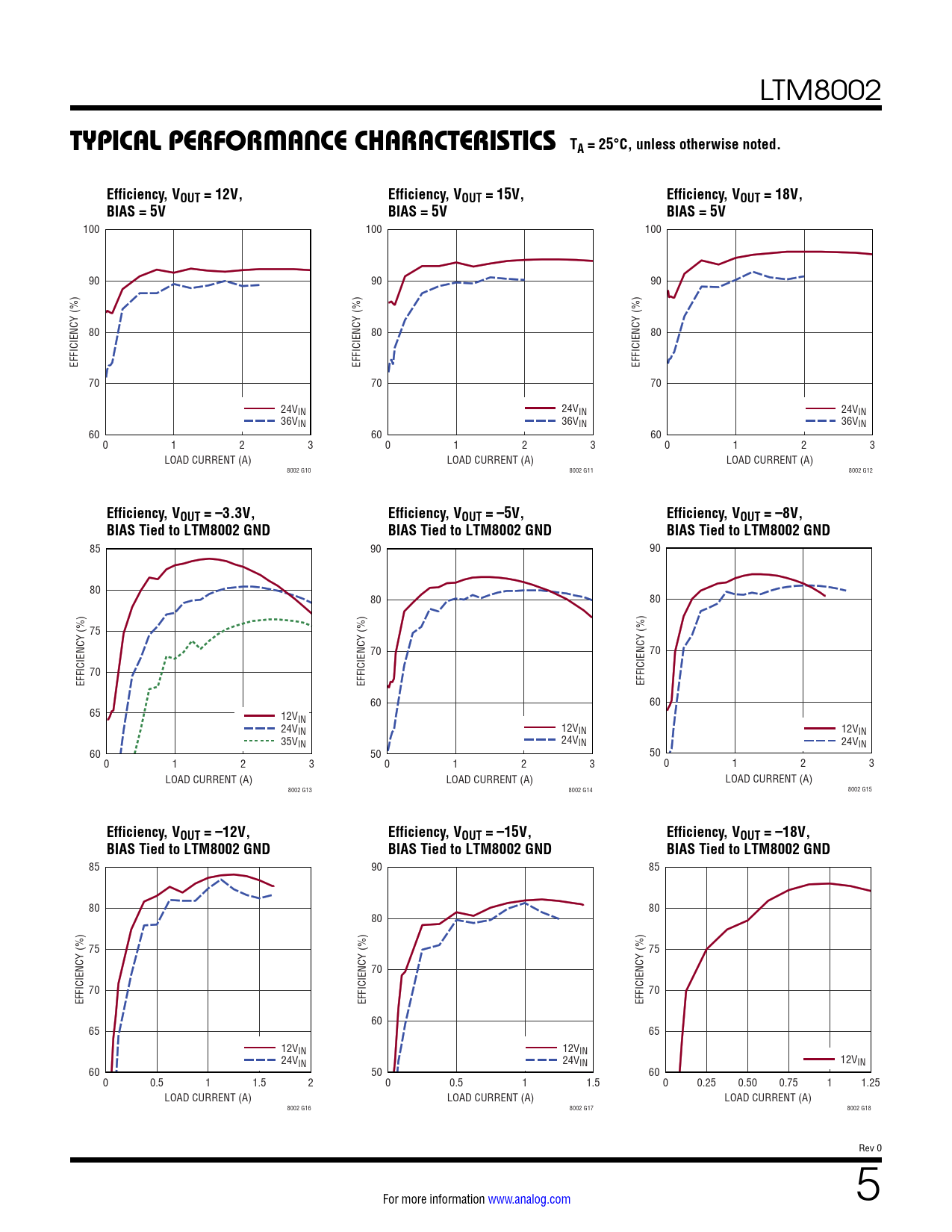Efficiency, VOUT = –12V, Efficiency, VOUT = –15V, Efficiency, VOUT = –18V, BIAS Tied to LTM8002 GND BIAS Tied to LTM8002 GND BIAS Tied to LTM8002 GND