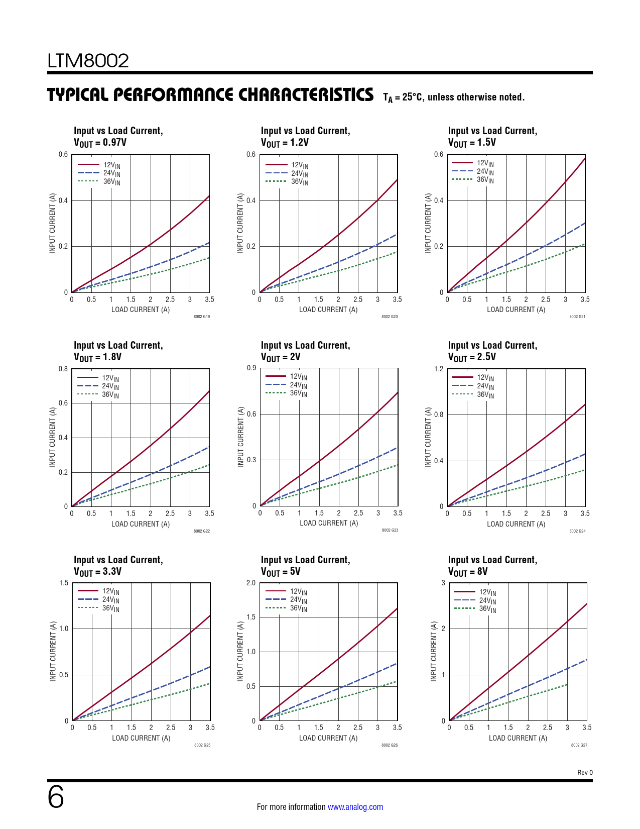 0.8 0.9 1.2 12VIN 12VIN 12VIN 24VIN 24VIN 24VIN 36VIN 36VIN 36VIN 0.6 0.6 0.8 0.4 0.3 0.4 INPUT CURRENT (A) INPUT CURRENT (A) INPUT CURRENT (A) 0.2 0 0 0 0 0.5 1 1.5 2 2.5 3 3.5 0 0.5 1 1.5 2 2.5 3 3.5 0 0.5 1 1.5 2 2.5 3 3.5 LOAD CURRENT (A) LOAD CURRENT (A) LOAD CURRENT (A) 8002 G22 8002 G23 8002 G24