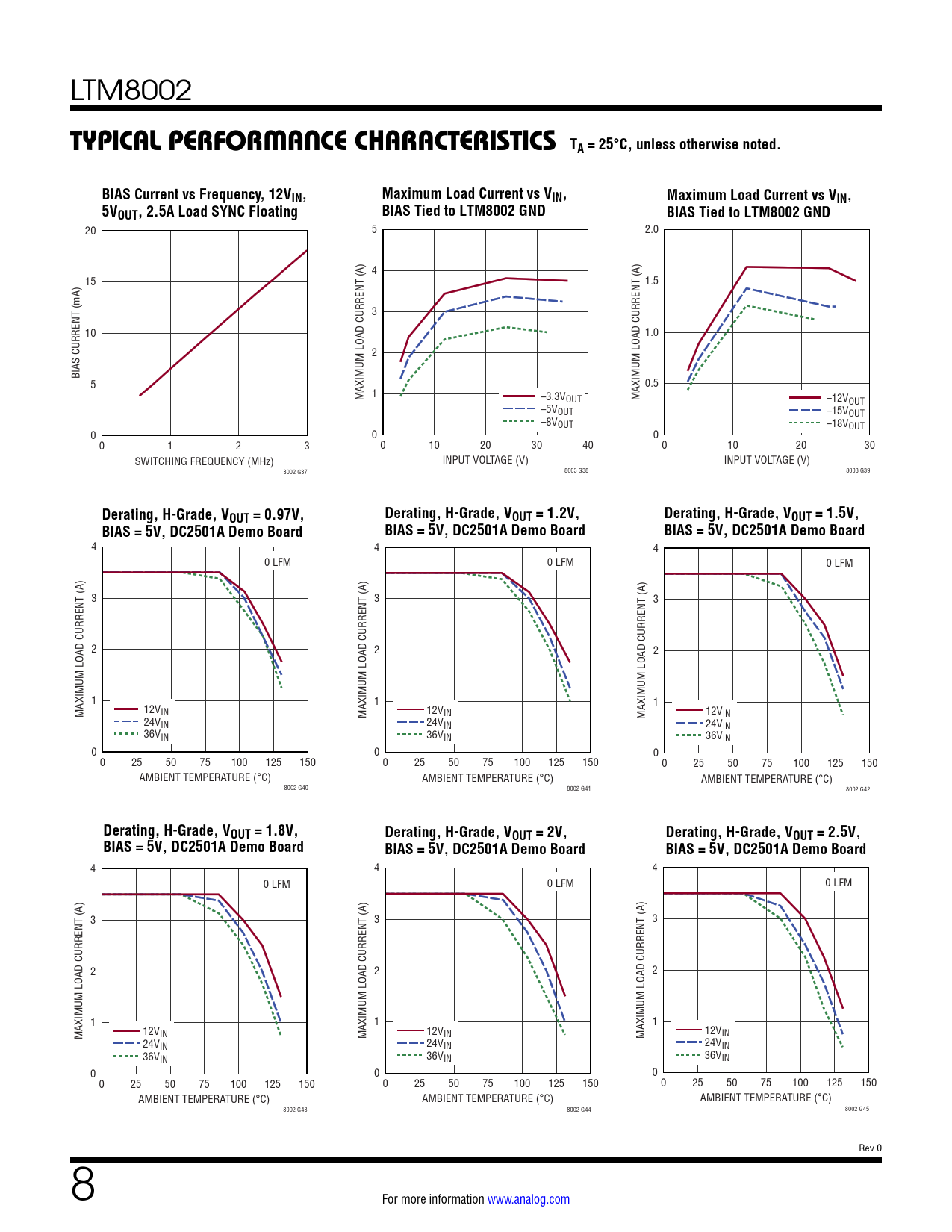 TYPICAL PERFORMANCE CHARACTERISTICS TA = 25°C, unless otherwise noted. BIAS Current vs Frequency, 12VIN, Maximum Load Current vs VIN, Maximum Load Current vs VIN, 5VOUT, 2.5A Load SYNC Floating BIAS Tied to LTM8002 GND BIAS Tied to LTM8002 GND