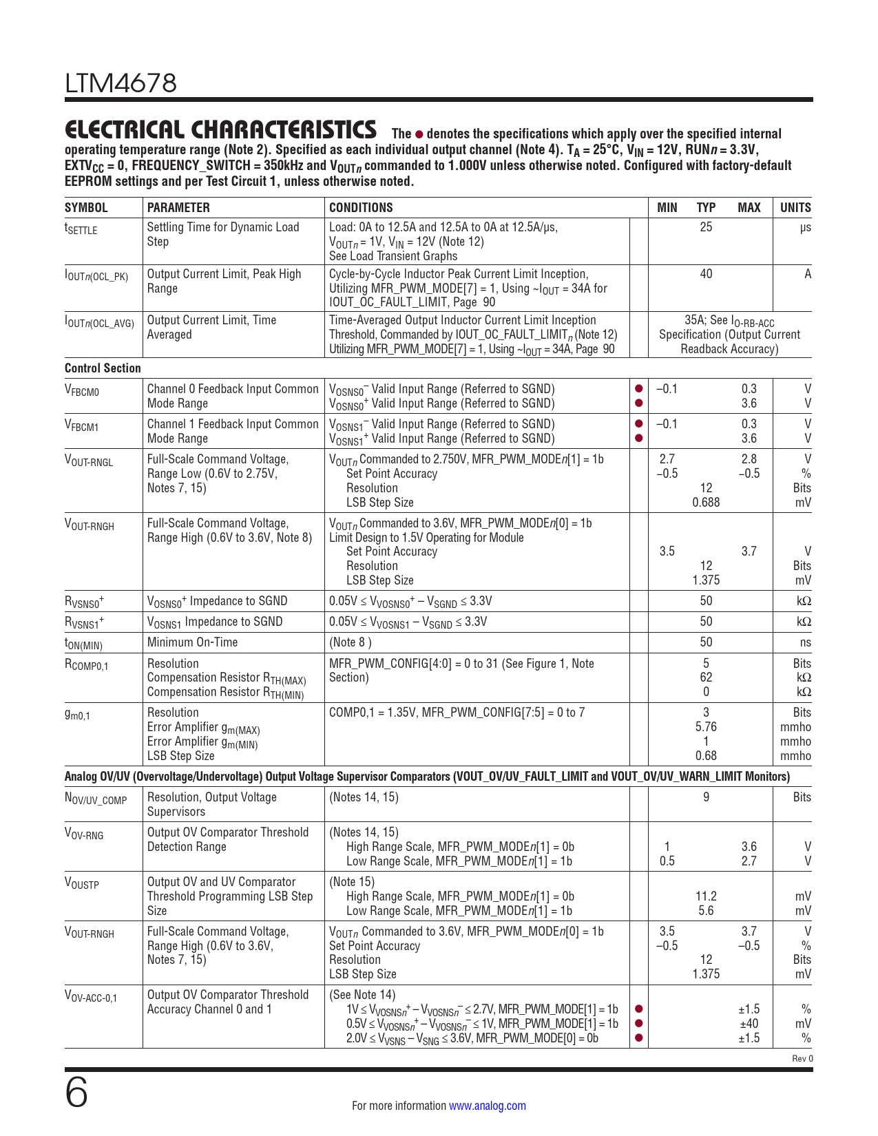 V – FBCM0 Channel 0 Feedback Input Common VOSNS0 Valid Input Range (Referred to SGND) l –0.1 0.3 V Mode Range V + OSNS0 Valid Input Range (Referred to SGND) l 3.6 V V – FBCM1 Channel 1 Feedback Input Common VOSNS1 Valid Input Range (Referred to SGND) l –0.1 0.3 V Mode Range V + OSNS1 Valid Input Range (Referred to SGND) l 3.6 V VOUT-RNGL Full-Scale Command Voltage, VOUTn Commanded to 2.750V, MFR_PWM_MODEn[1] = 1b 2.7 2.8 V Range Low (0.6V to 2.75V, Set Point Accuracy −0.5 −0.5 % Notes 7, 15) Resolution 12 Bits LSB Step Size 0.688 mV VOUT-RNGH Full-Scale Command Voltage, VOUTn Commanded to 3.6V, MFR_PWM_MODEn[0] = 1b Range High (0.6V to 3.6V, Note 8) Limit Design to 1.5V Operating for Module Set Point Accuracy 3.5 3.7 V Resolution 12 Bits LSB Step Size 1.375 mV R + + + VSNS0 VOSNS0 Impedance to SGND 0.05V ≤ VVOSNS0 – VSGND ≤ 3.3V 50 kΩ R + VSNS1 VOSNS1 Impedance to SGND 0.05V ≤ VVOSNS1 – VSGND ≤ 3.3V 50 kΩ tON(MIN) Minimum On-Time (Note 8 ) 50 ns RCOMP0,1 Resolution MFR_PWM_CONFIG[4:0] = 0 to 31 (See Figure 1, Note 5 Bits Compensation Resistor RTH(MAX) Section) 62 kΩ Compensation Resistor RTH(MIN) 0 kΩ gm0,1 Resolution COMP0,1 = 1.35V, MFR_PWM_CONFIG[7:5] = 0 to 7 3 Bits Error Amplifier gm(MAX) 5.76 mmho Error Amplifier gm(MIN) 1 mmho LSB Step Size 0.68 mmho