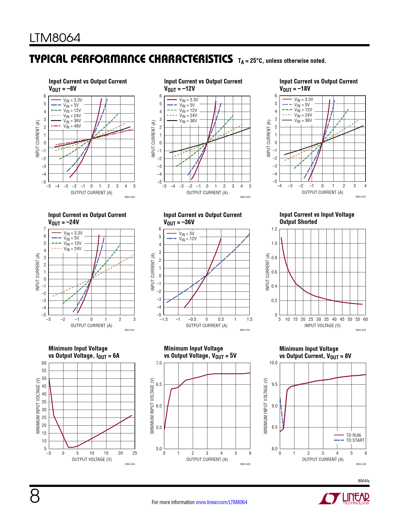 7 6 1.2 V 6 IN = 3.3V VIN = 5V V 5 IN = 5V VIN = 12V 5 VIN = 12V 4 1.0 4 VIN = 24V 3 3 2 0.8 2 1 1 0.6 0 0 –1 –1 0.4 INPUT CURRENT (A) INPUT CURRENT (A) INPUT CURRENT (A) –2 –2 –3 –3 0.2 –4 –4 –5 –5 0 –3 –2 –1 0 1 2 3 –1.5 –1 –0.5 0 0.5 1 1.5 5 10 15 20 25 30 35 40 45 50 55 60 OUTPUT CURRENT (A) OUTPUT CURRENT (A) INPUT VOLTAGE (V) 8064 G31 8064 G32 8064 G33