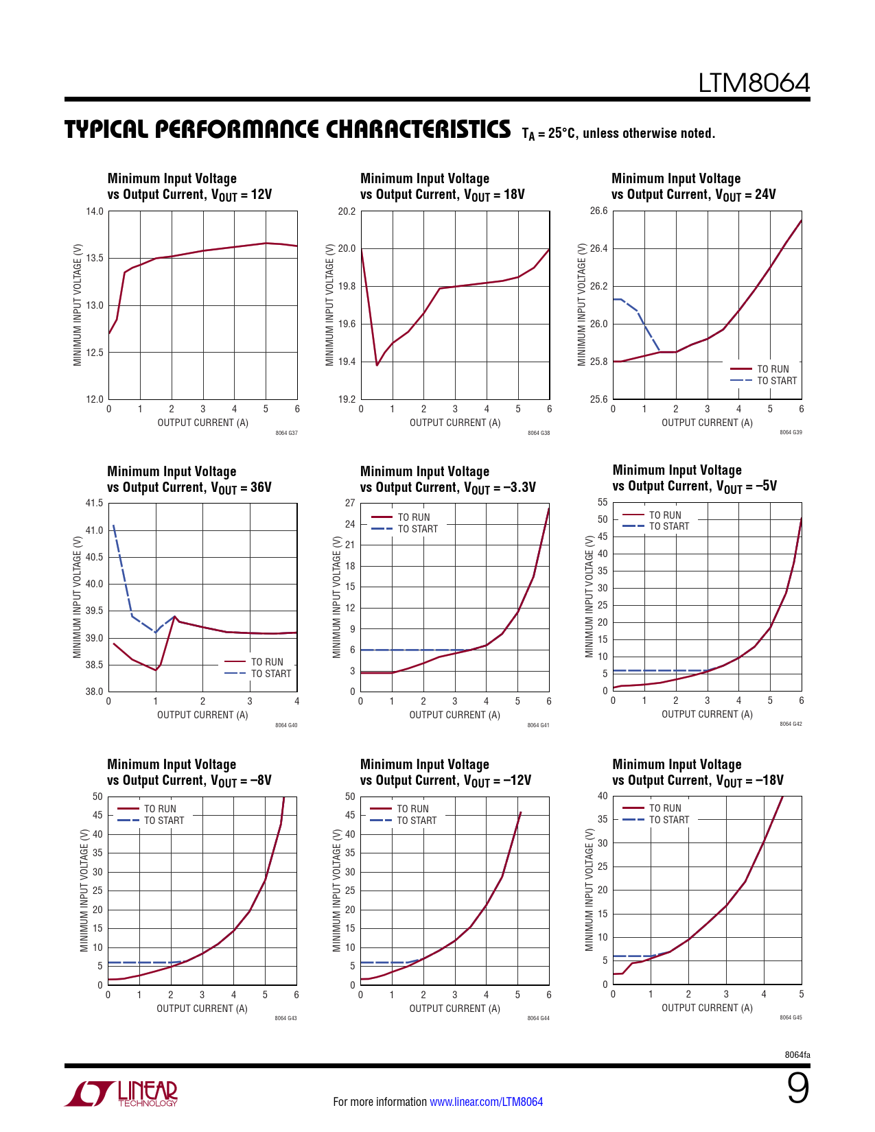 14.0 20.2 26.6 20.0 26.4 13.5 TAGE (V) TAGE (V) TAGE (V) 19.8 26.2 13.0 19.6 26.0 12.5 MINIMUM INPUT VOL MINIMUM INPUT VOL 19.4 MINIMUM INPUT VOL 25.8 TO RUN TO START 12.0 19.2 25.6 0 1 2 3 4 5 6 0 1 2 3 4 5 6 0 1 2 3 4 5 6 OUTPUT CURRENT (A) OUTPUT CURRENT (A) OUTPUT CURRENT (A) 8064 G37 8064 G38 8064 G39