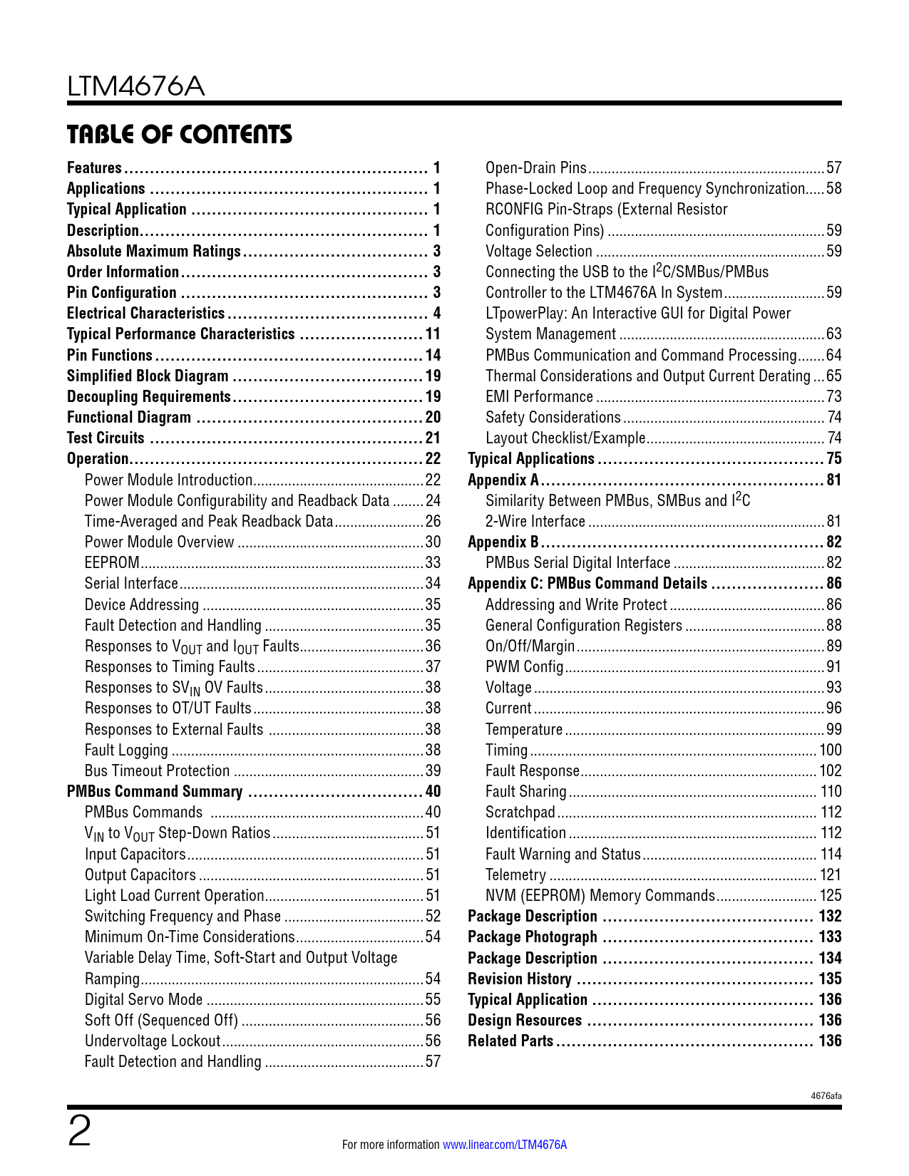 link to page 1 link to page 1 link to page 1 link to page 1 link to page 3 link to page 3 link to page 3 link to page 4 link to page 11 link to page 14 link to page 19 link to page 19 link to page 20 link to page 21 link to page 22 link to page 22 link to page 24 link to page 26 link to page 30 link to page 33 link to page 34 link to page 35 link to page 35 link to page 36 link to page 37 link to page 38 link to page 38 link to page 38 link to page 38 link to page 39 link to page 40 link to page 40 link to page 51 link to page 51 link to page 51 link to page 51 link to page 52 link to page 54 link to page 54 link to page 54 link to page 55 link to page 56 link to page 56 link to page 57 link to page 57 link to page 58 link to page 59 link to page 59 link to page 59 link to page 59 link to page 59 link to page 63 link to page 63 link to page 64 link to page 65 link to page 73 link to page 74 link to page 74 link to page 75 link to page 81 link to page 81 link to page 81 link to page 82 link to page 82 link to page 86 link to page 86 link to page 88 link to page 89 link to page 91 link to page 93 link to page 96 link to page 99 link to page 100 link to page 102 link to page 110 link to page 112 link to page 112 link to page 114 link to page 121 link to page 125 link to page 132 link to page 133 link to page 134 link to page 135 link to page 136 link to page 136 link to page 136 LTM4676A Table oF conTenTs Features ... 1 Open-Drain Pins ...57 Applications .. 1 Phase-Locked Loop and Frequency Synchronization...58 Typical Application .. 1 RCONFIG Pin-Straps (External Resistor Description.. 1 Configuration Pins) ..59 Absolute Maximum Ratings .. 3 Voltage Selection ...59 Order Information .. 3 Connecting the USB to the I2C/SMBus/PMBus Pin Configuration .. 3 Control er to the LTM4676A In System ..59 Electrical Characteristics ... 4 LTpowerPlay: An Interactive GUI for Digital Power Typical Performance Characteristics .. 11 System Management ...63 Pin Functions .. 14 PMBus Communication and Command Processing ...64 Simplified Block Diagram ... 19 Thermal Considerations and Output Current Derating ...65 Decoupling Requirements ... 19 EMI Performance ...73 Functional Diagram .. 20 Safety Considerations .. 74 Test Circuits ... 21 Layout Checklist/Example .. 74 Operation... 22Typical Applications .. 75 Power Module Introduction ..22 Appendix A ... 81 Power Module Configurability and Readback Data .. 24 Similarity Between PMBus, SMBus and I2C Time-Averaged and Peak Readback Data ...26 2-Wire Interface ...81 Power Module Overview ..30 Appendix B ... 82 EEPROM ...33 PMBus Serial Digital Interface ...82 Serial Interface ...34 Appendix C: PMBus Command Details .. 86 Device Addressing ...35 Addressing and Write Protect ..86 Fault Detection and Handling ...35 General Configuration Registers ..88 Responses to VOUT and IOUT Faults..36 On/Off/Margin ..89 Responses to Timing Faults ...37 PWM Config ...91 Responses to SVIN OV Faults ...38 Voltage ...93 Responses to OT/UT Faults ..38 Current ...96 Responses to External Faults ..38 Temperature ...99 Fault Logging ...38 Timing .. 100 Bus Timeout Protection ...39 Fault Response ... 102 PMBus Command Summary .. 40 Fault Sharing .. 110 PMBus Commands ...40 Scratchpad ... 112 VIN to VOUT Step-Down Ratios ... 51 Identification .. 112 Input Capacitors ... 51 Fault Warning and Status ... 114 Output Capacitors .. 51 Telemetry ... 121 Light Load Current Operation ... 51 NVM (EEPROM) Memory Commands .. 125 Switching Frequency and Phase ..52 Package Description ... 132 Minimum On-Time Considerations ...54 Package Photograph ... 133 Variable Delay Time, Soft-Start and Output Voltage Package Description ... 134 Ramping ...54 Revision History .. 135 Digital Servo Mode ..55 Typical Application ... 136 Soft Off (Sequenced Off) ...56 Design Resources .. 136 Undervoltage Lockout ..56 Related Parts .. 136 Fault Detection and Handling ...57 4676afa 2 For more information www.linear.com/LTM4676A Document Outline Features Applications Typical Application Description Absolute Maximum Ratings Order Information Pin Configuration Electrical Characteristics Typical Performance Characteristics Pin Functions Simplified Block Diagram Decoupling Requirements Functional Diagram Test Circuits Operation Power Module Introduction Power Module Configurability and Readback Data Time-Averaged and Peak Readback Data Power Module Overview EEPROM Serial Interface Device Addressing Fault Detection and Handling Responses to VOUT and IOUT Faults Responses to Timing Faults Responses to SVIN OV Faults Responses to OT/UT Faults Responses to External Faults Fault Logging Bus Timeout Protection PMBus Command Summary PMBus Commands VIN to VOUT Step-Down Ratios Input Capacitors Output Capacitors Light Load Current Operation Switching Frequency and Phase Minimum On-Time Considerations Variable Delay Time, Soft-Start and Output Voltage Ramping Digital Servo Mode Soft Off (Sequenced Off) Undervoltage Lockout Fault Detection and Handling Open-Drain Pins Phase-Locked Loop and Frequency Synchronization RCONFIG Pin-Straps (External Resistor Configuration Pins) Voltage Selection Connecting the USB to the I2C/SMBus/PMBus Controller to the LTM4676A In System LTpowerPlay: An Interactive GUI for Digital Power System Management PMBus Communication and Command Processing Thermal Considerations and Output Current Derating EMI Performance Safety Considerations Layout Checklist/Example Typical Applications Appendix A Similarity Between PMBus, SMBus and I2C 2-Wire Interface Appendix B PMBus Serial Digital Interface Appendix C: PMBus Command Details Addressing and Write Protect General Configuration Registers On/Off/Margin PWM Config Voltage Current Temperature Timing Fault Response Fault Sharing Scratchpad Identification Fault Warning and Status Telemetry NVM (EEPROM) Memory Commands Package Description Package Photograph Package Description Revision History Typical Application Design Resources Related Parts