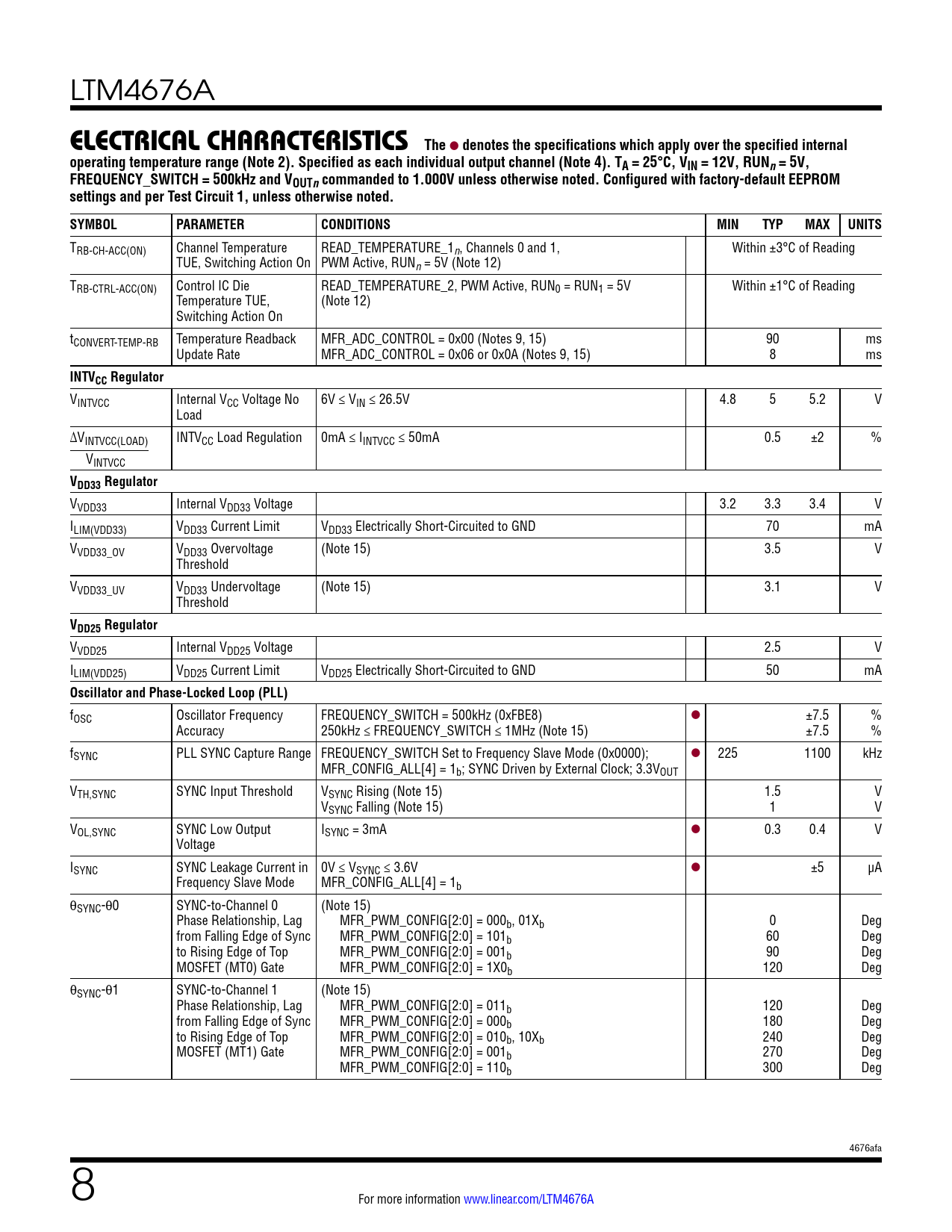 LTM4676A elecTrical characTerisTicsThe l denotes the specifications which apply over the specified internaloperating temperature range (Note 2). Specified as each individual output channel (Note 4). TA = 25°C, VIN = 12V, RUNn= 5V,FREQUENCY_SWITCH = 500kHz and VOUTncommanded to 1.000V unless otherwise noted. Configured with factory-default EEPROMsettings and per Test Circuit 1, unless otherwise noted.SYMBOLPARAMETERCONDITIONSMINTYPMAXUNITS TRB-CH-ACC(ON) Channel Temperature READ_TEMPERATURE_1n, Channels 0 and 1, Within ±3°C of Reading TUE, Switching Action On PWM Active, RUNn = 5V (Note 12) TRB-CTRL-ACC(ON) Control IC Die READ_TEMPERATURE_2, PWM Active, RUN0 = RUN1 = 5V Within ±1°C of Reading Temperature TUE, (Note 12) Switching Action On tCONVERT-TEMP-RB Temperature Readback MFR_ADC_CONTROL = 0x00 (Notes 9, 15) 90 ms Update Rate MFR_ADC_CONTROL = 0x06 or 0x0A (Notes 9, 15) 8 ms INTVCC Regulator VINTVCC Internal VCC Voltage No 6V ≤ VIN ≤ 26.5V 4.8 5 5.2 V Load ∆VINTVCC(LOAD) INTVCC Load Regulation 0mA ≤ IINTVCC ≤ 50mA 0.5 ±2 % VINTVCC VDD33 Regulator VVDD33 Internal VDD33 Voltage 3.2 3.3 3.4 V ILIM(VDD33) VDD33 Current Limit VDD33 Electrically Short-Circuited to GND 70 mA VVDD33_OV VDD33 Overvoltage (Note 15) 3.5 V Threshold VVDD33_UV VDD33 Undervoltage (Note 15) 3.1 V Threshold VDD25 Regulator VVDD25 Internal VDD25 Voltage 2.5 V ILIM(VDD25) VDD25 Current Limit VDD25 Electrically Short-Circuited to GND 50 mA Oscillator and Phase-Locked Loop (PLL) fOSC Oscillator Frequency FREQUENCY_SWITCH = 500kHz (0xFBE8) l ±7.5 % Accuracy 250kHz ≤ FREQUENCY_SWITCH ≤ 1MHz (Note 15) ±7.5 % fSYNC PLL SYNC Capture Range FREQUENCY_SWITCH Set to Frequency Slave Mode (0x0000); l 225 1100 kHz MFR_CONFIG_ALL[4] = 1b; SYNC Driven by External Clock; 3.3VOUT VTH,SYNC SYNC Input Threshold VSYNC Rising (Note 15) 1.5 V VSYNC Falling (Note 15) 1 V VOL,SYNC SYNC Low Output ISYNC = 3mA l 0.3 0.4 V Voltage ISYNC SYNC Leakage Current in 0V ≤ VSYNC ≤ 3.6V l ±5 µA Frequency Slave Mode MFR_CONFIG_ALL[4] = 1b θSYNC-θ0 SYNC-to-Channel 0 (Note 15) Phase Relationship, Lag MFR_PWM_CONFIG[2:0] = 000b, 01Xb 0 Deg from Falling Edge of Sync MFR_PWM_CONFIG[2:0] = 101b 60 Deg to Rising Edge of Top MFR_PWM_CONFIG[2:0] = 001b 90 Deg MOSFET (MT0) Gate MFR_PWM_CONFIG[2:0] = 1X0b 120 Deg θSYNC-θ1 SYNC-to-Channel 1 (Note 15) Phase Relationship, Lag MFR_PWM_CONFIG[2:0] = 011b 120 Deg from Falling Edge of Sync MFR_PWM_CONFIG[2:0] = 000b 180 Deg to Rising Edge of Top MFR_PWM_CONFIG[2:0] = 010b, 10Xb 240 Deg MOSFET (MT1) Gate MFR_PWM_CONFIG[2:0] = 001b 270 Deg MFR_PWM_CONFIG[2:0] = 110b 300 Deg 4676afa 8 For more information www.linear.com/LTM4676A Document Outline Features Applications Typical Application Description Absolute Maximum Ratings Order Information Pin Configuration Electrical Characteristics Typical Performance Characteristics Pin Functions Simplified Block Diagram Decoupling Requirements Functional Diagram Test Circuits Operation Power Module Introduction Power Module Configurability and Readback Data Time-Averaged and Peak Readback Data Power Module Overview EEPROM Serial Interface Device Addressing Fault Detection and Handling Responses to VOUT and IOUT Faults Responses to Timing Faults Responses to SVIN OV Faults Responses to OT/UT Faults Responses to External Faults Fault Logging Bus Timeout Protection PMBus Command Summary PMBus Commands VIN to VOUT Step-Down Ratios Input Capacitors Output Capacitors Light Load Current Operation Switching Frequency and Phase Minimum On-Time Considerations Variable Delay Time, Soft-Start and Output Voltage Ramping Digital Servo Mode Soft Off (Sequenced Off) Undervoltage Lockout Fault Detection and Handling Open-Drain Pins Phase-Locked Loop and Frequency Synchronization RCONFIG Pin-Straps (External Resistor Configuration Pins) Voltage Selection Connecting the USB to the I2C/SMBus/PMBus Controller to the LTM4676A In System LTpowerPlay: An Interactive GUI for Digital Power System Management PMBus Communication and Command Processing Thermal Considerations and Output Current Derating EMI Performance Safety Considerations Layout Checklist/Example Typical Applications Appendix A Similarity Between PMBus, SMBus and I2C 2-Wire Interface Appendix B PMBus Serial Digital Interface Appendix C: PMBus Command Details Addressing and Write Protect General Configuration Registers On/Off/Margin PWM Config Voltage Current Temperature Timing Fault Response Fault Sharing Scratchpad Identification Fault Warning and Status Telemetry NVM (EEPROM) Memory Commands Package Description Package Photograph Package Description Revision History Typical Application Design Resources Related Parts