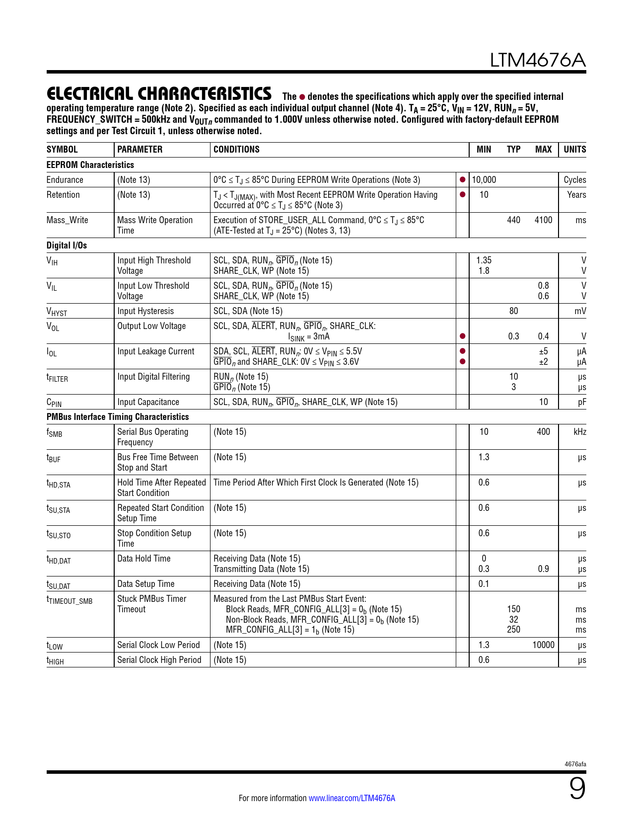 LTM4676A elecTrical characTerisTicsThe l denotes the specifications which apply over the specified internaloperating temperature range (Note 2). Specified as each individual output channel (Note 4). TA = 25°C, VIN = 12V, RUNn= 5V,FREQUENCY_SWITCH = 500kHz and VOUTncommanded to 1.000V unless otherwise noted. Configured with factory-default EEPROMsettings and per Test Circuit 1, unless otherwise noted.SYMBOLPARAMETERCONDITIONSMINTYPMAXUNITSEEPROM Characteristics Endurance (Note 13) 0°C ≤ TJ ≤ 85°C During EEPROM Write Operations (Note 3) l 10,000 Cycles Retention (Note 13) TJ < TJ(MAX), with Most Recent EEPROM Write Operation Having l 10 Years Occurred at 0°C ≤ TJ ≤ 85°C (Note 3) Mass_Write Mass Write Operation Execution of STORE_USER_ALL Command, 0°C ≤ TJ ≤ 85°C 440 4100 ms Time (ATE-Tested at TJ = 25°C) (Notes 3, 13) Digital I/Os VIH Input High Threshold SCL, SDA, RUNn, GPIOn (Note 15) 1.35 V Voltage SHARE_CLK, WP (Note 15) 1.8 V VIL Input Low Threshold SCL, SDA, RUNn, GPIOn (Note 15) 0.8 V Voltage SHARE_CLK, WP (Note 15) 0.6 V VHYST Input Hysteresis SCL, SDA (Note 15) 80 mV VOL Output Low Voltage SCL, SDA, ALERT, RUNn, GPIOn, SHARE_CLK: ISINK = 3mA l 0.3 0.4 V IOL Input Leakage Current SDA, SCL, ALERT, RUNn: 0V ≤ VPIN ≤ 5.5V l ±5 µA GPIOn and SHARE_CLK: 0V ≤ VPIN ≤ 3.6V l ±2 µA tFILTER Input Digital Filtering RUNn (Note 15) 10 µs GPIOn (Note 15) 3 µs CPIN Input Capacitance SCL, SDA, RUNn, GPIOn, SHARE_CLK, WP (Note 15) 10 pF PMBus Interface Timing Characteristics fSMB Serial Bus Operating (Note 15) 10 400 kHz Frequency tBUF Bus Free Time Between (Note 15) 1.3 μs Stop and Start tHD,STA Hold Time After Repeated Time Period After Which First Clock Is Generated (Note 15) 0.6 µs Start Condition tSU,STA Repeated Start Condition (Note 15) 0.6 μs Setup Time tSU,STO Stop Condition Setup (Note 15) 0.6 μs Time tHD,DAT Data Hold Time Receiving Data (Note 15) 0 µs Transmitting Data (Note 15) 0.3 0.9 µs tSU,DAT Data Setup Time Receiving Data (Note 15) 0.1 μs tTIMEOUT_SMB Stuck PMBus Timer Measured from the Last PMBus Start Event: Timeout Block Reads, MFR_CONFIG_ALL[3] = 0b (Note 15) 150 ms Non-Block Reads, MFR_CONFIG_ALL[3] = 0b (Note 15) 32 ms MFR_CONFIG_ALL[3] = 1b (Note 15) 250 ms tLOW Serial Clock Low Period (Note 15) 1.3 10000 μs tHIGH Serial Clock High Period (Note 15) 0.6 μs 4676afa For more information www.linear.com/LTM4676A 9 Document Outline Features Applications Typical Application Description Absolute Maximum Ratings Order Information Pin Configuration Electrical Characteristics Typical Performance Characteristics Pin Functions Simplified Block Diagram Decoupling Requirements Functional Diagram Test Circuits Operation Power Module Introduction Power Module Configurability and Readback Data Time-Averaged and Peak Readback Data Power Module Overview EEPROM Serial Interface Device Addressing Fault Detection and Handling Responses to VOUT and IOUT Faults Responses to Timing Faults Responses to SVIN OV Faults Responses to OT/UT Faults Responses to External Faults Fault Logging Bus Timeout Protection PMBus Command Summary PMBus Commands VIN to VOUT Step-Down Ratios Input Capacitors Output Capacitors Light Load Current Operation Switching Frequency and Phase Minimum On-Time Considerations Variable Delay Time, Soft-Start and Output Voltage Ramping Digital Servo Mode Soft Off (Sequenced Off) Undervoltage Lockout Fault Detection and Handling Open-Drain Pins Phase-Locked Loop and Frequency Synchronization RCONFIG Pin-Straps (External Resistor Configuration Pins) Voltage Selection Connecting the USB to the I2C/SMBus/PMBus Controller to the LTM4676A In System LTpowerPlay: An Interactive GUI for Digital Power System Management PMBus Communication and Command Processing Thermal Considerations and Output Current Derating EMI Performance Safety Considerations Layout Checklist/Example Typical Applications Appendix A Similarity Between PMBus, SMBus and I2C 2-Wire Interface Appendix B PMBus Serial Digital Interface Appendix C: PMBus Command Details Addressing and Write Protect General Configuration Registers On/Off/Margin PWM Config Voltage Current Temperature Timing Fault Response Fault Sharing Scratchpad Identification Fault Warning and Status Telemetry NVM (EEPROM) Memory Commands Package Description Package Photograph Package Description Revision History Typical Application Design Resources Related Parts