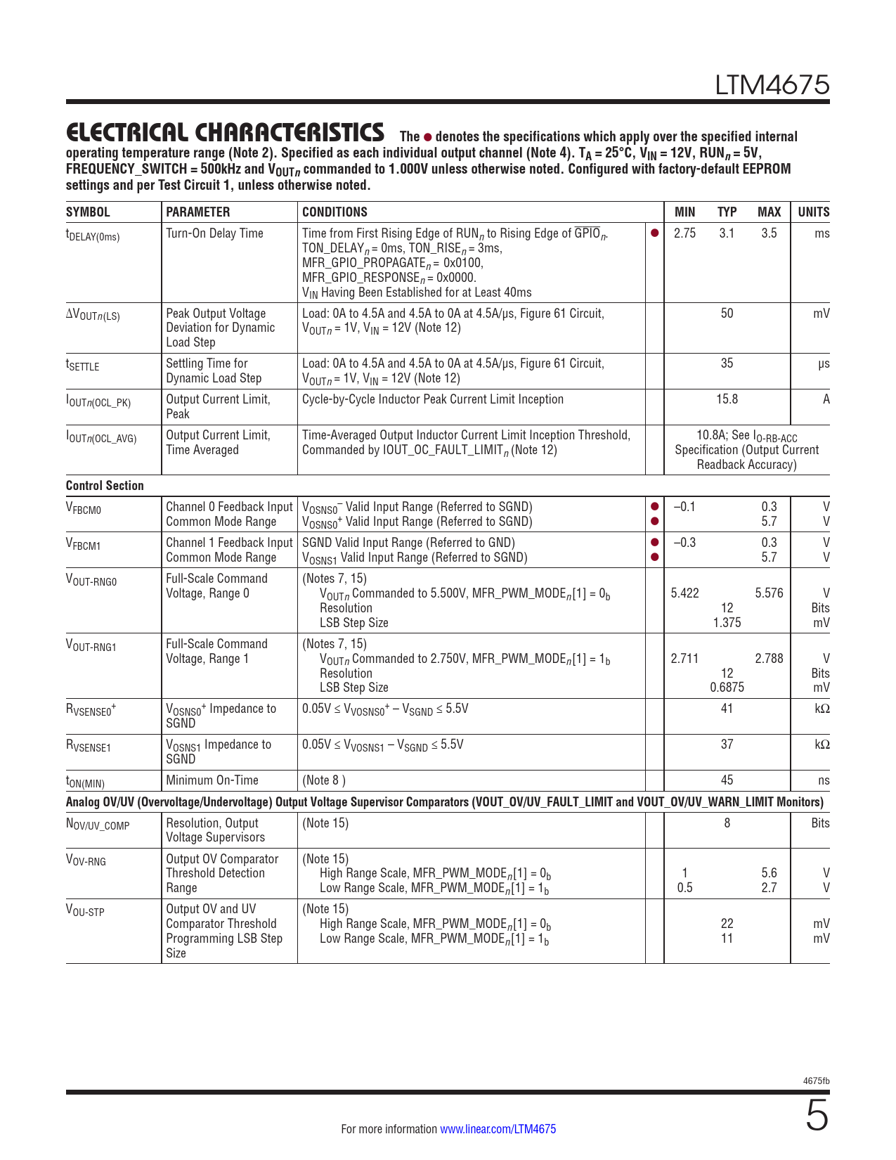 link to page 132 link to page 132 LTM4675 e lecTrical characTerisTics The l denotes the specifications which apply over the specified internaloperating temperature range (Note 2). Specified as each individual output channel (Note 4). TA = 25°C, VIN = 12V, RUNn= 5V,FREQUENCY_SWITCH = 500kHz and VOUTncommanded to 1.000V unless otherwise noted. Configured with factory-default EEPROMsettings and per Test Circuit 1, unless otherwise noted.SYMBOLPARAMETERCONDITIONSMINTYPMAXUNITS tDELAY(0ms) Turn-On Delay Time Time from First Rising Edge of RUNn to Rising Edge of GPIOn. l 2.75 3.1 3.5 ms TON_DELAYn = 0ms, TON_RISEn = 3ms, MFR_GPIO_PROPAGATEn = 0x0100, MFR_GPIO_RESPONSEn = 0x0000. VIN Having Been Established for at Least 40ms ∆VOUTn(LS) Peak Output Voltage Load: 0A to 4.5A and 4.5A to 0A at 4.5A/µs, Figure 61 Circuit, 50 mV Deviation for Dynamic VOUTn = 1V, VIN = 12V (Note 12) Load Step tSETTLE Settling Time for Load: 0A to 4.5A and 4.5A to 0A at 4.5A/µs, Figure 61 Circuit, 35 µs Dynamic Load Step VOUTn = 1V, VIN = 12V (Note 12) IOUTn(OCL_PK) Output Current Limit, Cycle-by-Cycle Inductor Peak Current Limit Inception 15.8 A Peak IOUTn(OCL_AVG) Output Current Limit, Time-Averaged Output Inductor Current Limit Inception Threshold, 10.8A; See IO-RB-ACC Time Averaged Commanded by IOUT_OC_FAULT_LIMITn (Note 12) Specification (Output Current Readback Accuracy) Control Section V – FBCM0 Channel 0 Feedback Input VOSNS0 Valid Input Range (Referred to SGND) l –0.1 0.3 V Common Mode Range V + OSNS0 Valid Input Range (Referred to SGND) l 5.7 V VFBCM1 Channel 1 Feedback Input SGND Valid Input Range (Referred to GND) l –0.3 0.3 V Common Mode Range VOSNS1 Valid Input Range (Referred to SGND) l 5.7 V VOUT-RNG0 Full-Scale Command (Notes 7, 15) Voltage, Range 0 VOUTn Commanded to 5.500V, MFR_PWM_MODEn[1] = 0b 5.422 5.576 V Resolution 12 Bits LSB Step Size 1.375 mV VOUT-RNG1 Full-Scale Command (Notes 7, 15) Voltage, Range 1 VOUTn Commanded to 2.750V, MFR_PWM_MODEn[1] = 1b 2.711 2.788 V Resolution 12 Bits LSB Step Size 0.6875 mV R + + + VSENSE0 VOSNS0 Impedance to 0.05V ≤ VVOSNS0 – VSGND ≤ 5.5V 41 kΩ SGND RVSENSE1 VOSNS1 Impedance to 0.05V ≤ VVOSNS1 – VSGND ≤ 5.5V 37 kΩ SGND tON(MIN) Minimum On-Time (Note 8 ) 45 ns Analog OV/UV (Overvoltage/Undervoltage) Output Voltage Supervisor Comparators (VOUT_OV/UV_FAULT_LIMIT and VOUT_OV/UV_WARN_LIMIT Monitors) NOV/UV_COMP Resolution, Output (Note 15) 8 Bits Voltage Supervisors VOV-RNG Output OV Comparator (Note 15) Threshold Detection High Range Scale, MFR_PWM_MODEn[1] = 0b 1 5.6 V Range Low Range Scale, MFR_PWM_MODEn[1] = 1b 0.5 2.7 V VOU-STP Output OV and UV (Note 15) Comparator Threshold High Range Scale, MFR_PWM_MODEn[1] = 0b 22 mV Programming LSB Step Low Range Scale, MFR_PWM_MODEn[1] = 1b 11 mV Size 4675fb For more information www.linear.com/LTM4675 5 Document Outline Features Applications Typical Application Description Absolute Maximum Ratings Order Information Pin Configuration Electrical Characteristics Typical Performance Characteristics Pin Functions Simplified Block Diagram Decoupling Requirements Functional Diagram Test Circuits Operation Power Module Introduction Power Module Configurability and Readback Data Time-Averaged and Peak Readback Data Power Module Overview EEPROM Serial Interface Device Addressing Fault Detection and Handling Responses to VOUT and IOUT Faults Responses to Timing Faults Responses to SVIN OV Faults Responses to OT/UT Faults Responses to External Faults Fault Logging Bus Timeout Protection PMBus Command Summary PMBus Commands VIN to VOUT Step-Down Ratios Input Capacitors Output Capacitors Light Load Current Operation Switching Frequency and Phase Minimum On-Time Considerations Variable Delay Time, Soft-Start and Output Voltage Ramping Digital Servo Mode Soft Off (Sequenced Off) Undervoltage Lockout Fault Detection and Handling Open-Drain Pins Phase-Locked Loop and Frequency Synchronization RCONFIG Pin-Straps (External Resistor Configuration Pins) Voltage Selection Connecting the USB to the I2C/SMBus/PMBus Controller to the LTM4675 In System LTpowerPlay: An Interactive GUI for Digital Power System Management PMBus Communication and Command Processing Thermal Considerations and Output Current Derating EMI Performance Safety Considerations Layout Checklist/Example Typical Applications Appendix A Similarity Between PMBus, SMBus and I2C 2-Wire Interface Appendix B PMBus Serial Digital Interface Appendix C: PMBus Command Details Addressing and Write Protect General Configuration Registers On/Off/Margin PWM Config Voltage Current Temperature Timing Fault Response Fault Sharing Scratchpad Identification Fault Warning and Status Telemetry NVM (EEPROM) Memory Commands Package Description Package Photograph Package Description Revision History Typical Application Design Resources Related Parts