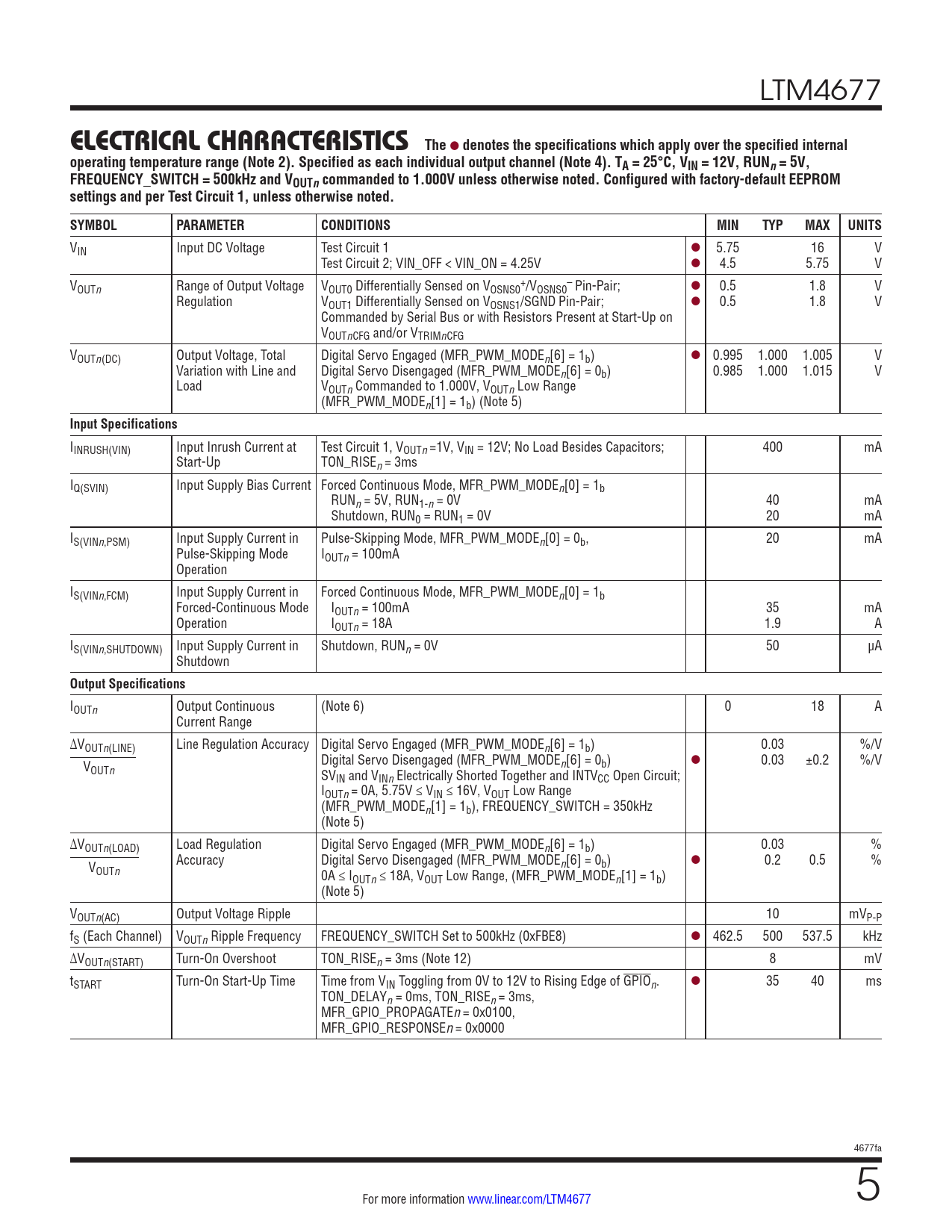 LTM4677 elecTrical characTerisTicsThe l denotes the specifications which apply over the specified internaloperating temperature range (Note 2). Specified as each individual output channel (Note 4). TA = 25°C, VIN = 12V, RUNn= 5V,FREQUENCY_SWITCH = 500kHz and VOUTncommanded to 1.000V unless otherwise noted. Configured with factory-default EEPROMsettings and per Test Circuit 1, unless otherwise noted.SYMBOLPARAMETERCONDITIONSMINTYPMAXUNITS VIN Input DC Voltage Test Circuit 1 l 5.75 16 V Test Circuit 2; VIN_OFF < VIN_ON = 4.25V l 4.5 5.75 V V + – OUTn Range of Output Voltage VOUT0 Differentially Sensed on VOSNS0 /VOSNS0 Pin-Pair; l 0.5 1.8 V Regulation VOUT1 Differentially Sensed on VOSNS1/SGND Pin-Pair; l 0.5 1.8 V Commanded by Serial Bus or with Resistors Present at Start-Up on VOUTnCFG and/or VTRIMnCFG VOUTn(DC) Output Voltage, Total Digital Servo Engaged (MFR_PWM_MODEn[6] = 1b) l 0.995 1.000 1.005 V Variation with Line and Digital Servo Disengaged (MFR_PWM_MODEn[6] = 0b) 0.985 1.000 1.015 V Load VOUTn Commanded to 1.000V, VOUTn Low Range (MFR_PWM_MODEn[1] = 1b) (Note 5) Input Specifications IINRUSH(VIN) Input Inrush Current at Test Circuit 1, VOUTn =1V, VIN = 12V; No Load Besides Capacitors; 400 mA Start-Up TON_RISEn = 3ms IQ(SVIN) Input Supply Bias Current Forced Continuous Mode, MFR_PWM_MODEn[0] = 1b RUNn = 5V, RUN1-n = 0V 40 mA Shutdown, RUN0 = RUN1 = 0V 20 mA IS(VINn,PSM) Input Supply Current in Pulse-Skipping Mode, MFR_PWM_MODEn[0] = 0b, 20 mA Pulse-Skipping Mode IOUTn = 100mA Operation IS(VINn,FCM) Input Supply Current in Forced Continuous Mode, MFR_PWM_MODEn[0] = 1b Forced-Continuous Mode IOUTn = 100mA 35 mA Operation IOUTn = 18A 1.9 A IS(VINn,SHUTDOWN) Input Supply Current in Shutdown, RUNn = 0V 50 µA Shutdown Output Specifications IOUTn Output Continuous (Note 6) 0 18 A Current Range ∆VOUTn(LINE) Line Regulation Accuracy Digital Servo Engaged (MFR_PWM_MODEn[6] = 1b) 0.03 %/V V Digital Servo Disengaged (MFR_PWM_MODEn[6] = 0b) l 0.03 ±0.2 %/V OUTn SVIN and VINn Electrically Shorted Together and INTVCC Open Circuit; IOUTn = 0A, 5.75V ≤ VIN ≤ 16V, VOUT Low Range (MFR_PWM_MODEn[1] = 1b), FREQUENCY_SWITCH = 350kHz (Note 5) ∆VOUTn(LOAD) Load Regulation Digital Servo Engaged (MFR_PWM_MODEn[6] = 1b) 0.03 % Accuracy Digital Servo Disengaged (MFR_PWM_MODEn[6] = 0b) l 0.2 0.5 % VOUTn 0A ≤ IOUTn ≤ 18A, VOUT Low Range, (MFR_PWM_MODEn[1] = 1b) (Note 5) VOUTn(AC) Output Voltage Ripple 10 mVP-P fS (Each Channel) VOUTn Ripple Frequency FREQUENCY_SWITCH Set to 500kHz (0xFBE8) l 462.5 500 537.5 kHz ∆VOUTn(START) Turn-On Overshoot TON_RISEn = 3ms (Note 12) 8 mV tSTART Turn-On Start-Up Time Time from VIN Toggling from 0V to 12V to Rising Edge of GPIOn. l 35 40 ms TON_DELAYn = 0ms, TON_RISEn = 3ms, MFR_GPIO_PROPAGATEn = 0x0100, MFR_GPIO_RESPONSEn = 0x0000 4677fa For more information www.linear.com/LTM4677 5 Document Outline Features Applications Typical Application Description Absolute Maximum Ratings Order Information Pin Configuration Electrical Characteristics Typical Performance Characteristics Pin Functions Simplified Block Diagram Decoupling Requirements Functional Diagram Test Circuits Operation Power Module Introduction Power Module Configurability and Readback Data Time-Averaged and Peak Readback Data Power Module Overview EEPROM Serial Interface Device Addressing Fault Detection and Handling Responses to VOUT and IOUT Faults Responses to Timing Faults Responses to SVIN OV Faults Responses to OT/UT Faults Responses to External Faults Fault Logging Bus Timeout Protection PMBus Command Summary PMBus Commands Applications Information VIN to VOUT Step-Down Ratios Input Capacitors Output Capacitors Light Load Current Operation Switching Frequency and Phase Minimum On-Time Considerations Variable Delay Time, Soft-Start and Output Voltage Ramping Digital Servo Mode Soft Off (Sequenced Off) Undervoltage Lockout Fault DETECTION AND HANDLING Open-Drain Pins Phase-Locked Loop and Frequency Synchronization RCONFIG Pin-Straps (External Resistor Configuration Pins) Voltage Selection Connecting the USB to the I2C/SMBus/PMBus Controller to the LTM4677 In System PMBus Communication and Command Processing Thermal Considerations and Output Current Derating Applications Information-Derating Curves EMI Performance Safety Considerations Layout Checklist/Example Typical Applications Appendix A Similarity Between PMBus, SMBus and I2C 2-Wire Interface Appendix B PMBus Serial Digital Interface Appendix C: PMBus Command Details Addressing and Write Protect General Configuration Registers On/Off/Margin PWM Config Voltage Current Temperature Timing Fault Response Fault Sharing Scratchpad Identification Fault Warning and Status Telemetry NVM (EEPROM) Memory Commands Package Description Package Photograph Revision History Typical Application Design Resources Related Parts