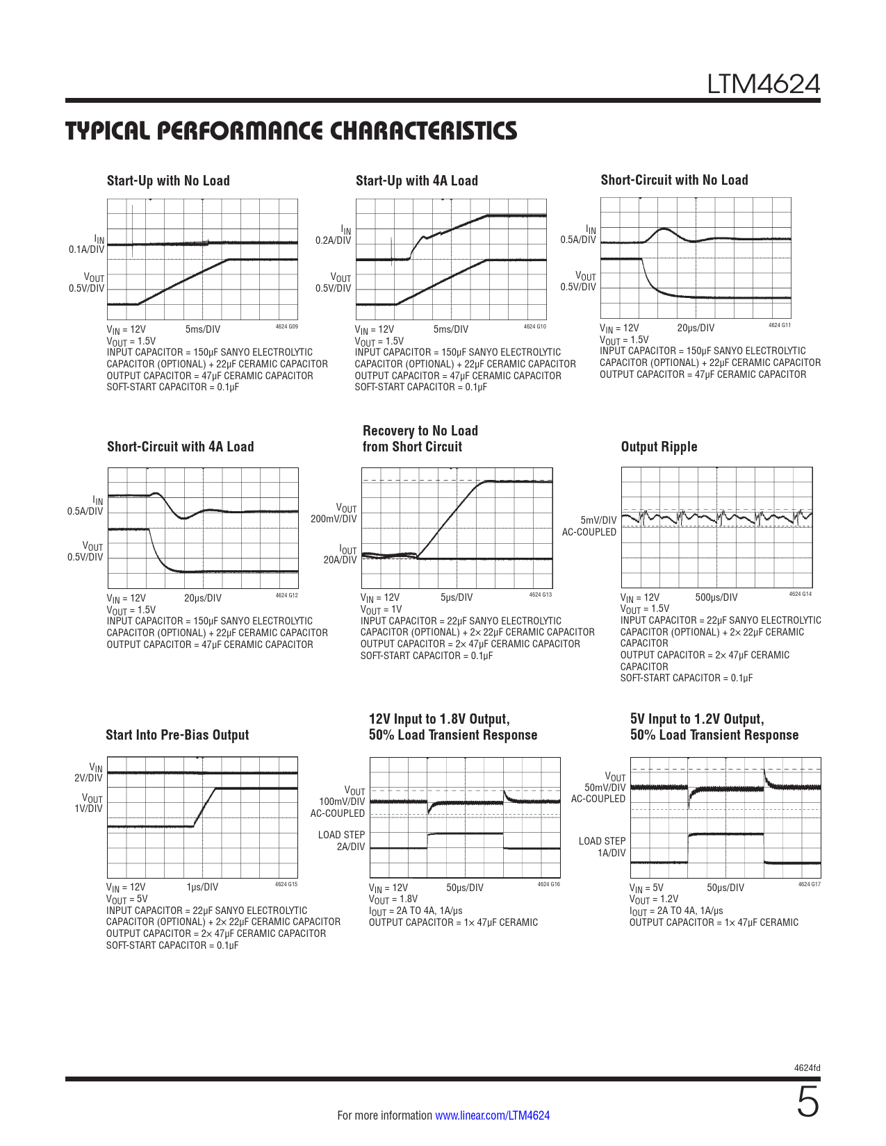 IIN 0.5A/DIV VOUT 200mV/DIV 5mV/DIV AC-COUPLED VOUT I 0.5V/DIV OUT 20A/DIV VIN = 12V 20µs/DIV 4624 G12 VIN = 12V 5µs/DIV 4624 G13 VIN = 12V 500µs/DIV 4624 G14 VOUT = 1.5V VOUT = 1V VOUT = 1.5V INPUT CAPACITOR = 150µF SANYO ELECTROLYTIC INPUT CAPACITOR = 22µF SANYO ELECTROLYTIC INPUT CAPACITOR = 22µF SANYO ELECTROLYTIC CAPACITOR (OPTIONAL) + 22µF CERAMIC CAPACITOR CAPACITOR (OPTIONAL) + 2× 22µF CERAMIC CAPACITOR CAPACITOR (OPTIONAL) + 2× 22µF CERAMIC OUTPUT CAPACITOR = 47µF CERAMIC CAPACITOR OUTPUT CAPACITOR = 2× 47µF CERAMIC CAPACITOR CAPACITOR SOFT-START CAPACITOR = 0.1µF OUTPUT CAPACITOR = 2× 47µF CERAMIC CAPACITOR SOFT-START CAPACITOR = 0.1µF