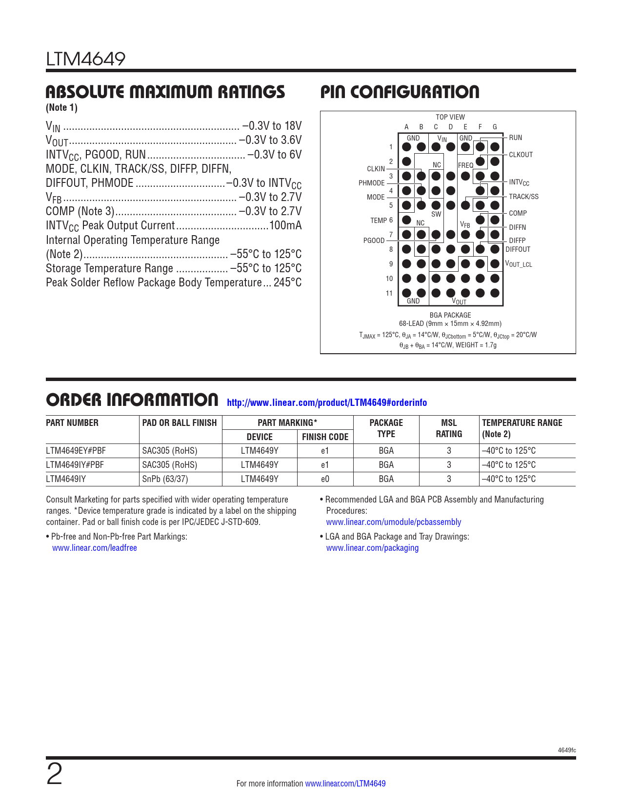 ABSOLUTE MAXIMUM RATINGS. PIN CONFIGURATION. (Note 1). ORDER INFORMATION http://www.linear.com/product/LTM4649#orderinfo