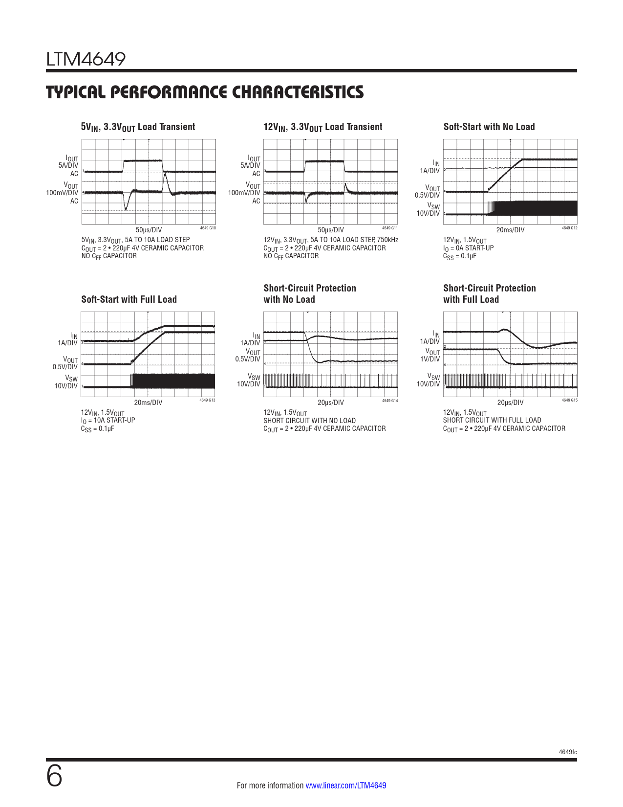 IOUT IOUT 5A/DIV 5A/DIV IIN AC AC 1A/DIV VOUT VOUT V 100mV/DIV 100mV/DIV OUT 0.5V/DIV AC AC VSW 10V/DIV 50µs/DIV 4649 G10 50µs/DIV 4649 G11 20ms/DIV 4649 G12 5VIN, 3.3VOUT, 5A TO 10A LOAD STEP 12VIN, 3.3VOUT, 5A TO 10A LOAD STEP, 750kHz 12VIN, 1.5VOUT COUT = 2 • 220µF 4V CERAMIC CAPACITOR COUT = 2 • 220µF 4V CERAMIC CAPACITOR IO = 0A START-UP NO CFF CAPACITOR NO CFF CAPACITOR CSS = 0.1µF