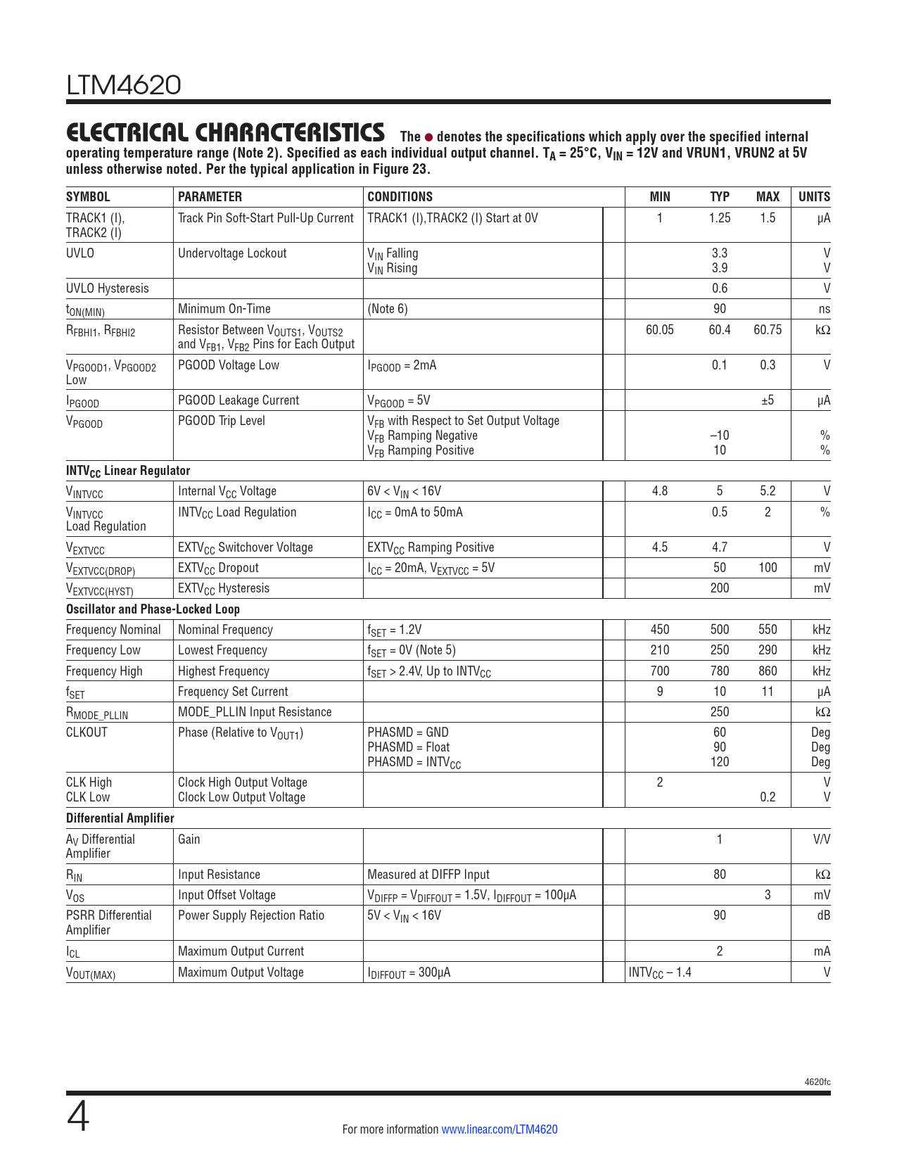 AV Differential Gain 1 V/V Amplifier RIN Input Resistance Measured at DIFFP Input 80 kΩ VOS Input Offset Voltage VDIFFP = VDIFFOUT = 1.5V, IDIFFOUT = 100µA 3 mV PSRR Differential Power Supply Rejection Ratio 5V < VIN < 16V 90 dB Amplifier ICL Maximum Output Current 2 mA VOUT(MAX) Maximum Output Voltage IDIFFOUT = 300µA INTVCC – 1.4 V 4620fc 4 For more information www.linear.com/LTM4620 Document Outline Features Applications Description Typical Application Absolute Maximum Ratings Pin Configuration Order Information Typical Performance Characteristics Pin Functions Simplified Block Diagram Decoupling Requirements Operation Applications Information Typical Applications Package Description Package Photo Related Parts