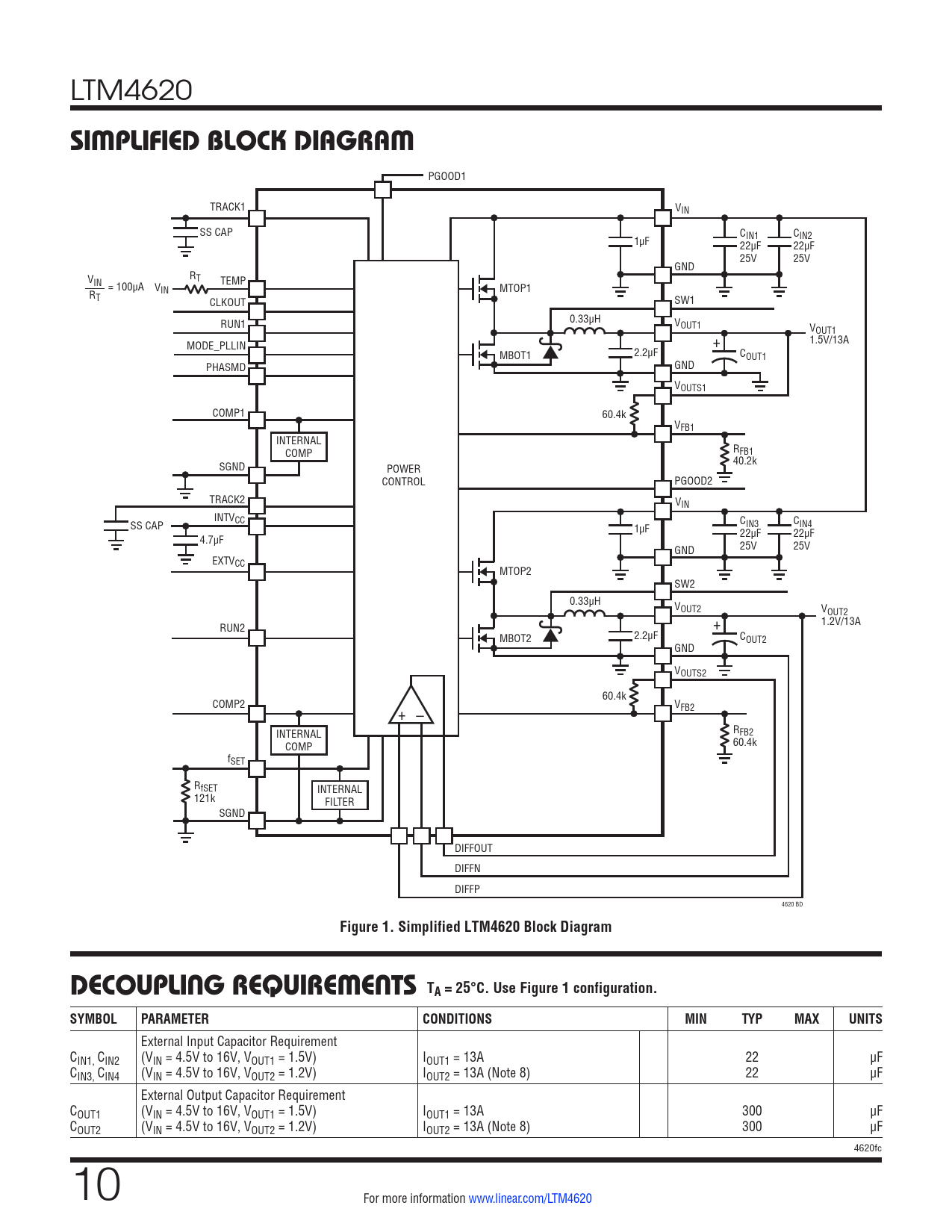 Figure 1. Simplified LTM4620 Block Diagram DECOUPLING REQUIREMENTS TA = 25°C. Use Figure 1 configuration. SYMBOL PARAMETER CONDITIONS MIN TYP MAX UNITS