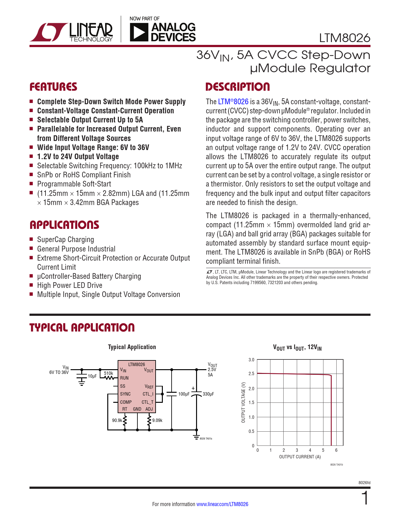 LTM8026 36VIN, 5A CVCC Step-Down µModule Regulator FEATURESDESCRIPTION n Complete Step-Down Switch Mode Power Supply The LTM®8026 is a 36VIN, 5A constant-voltage, constant- n Constant-Voltage Constant-Current Operation current (CVCC) step-down µModule® regulator. Included in n Selectable Output Current Up to 5A the package are the switching controller, power switches, n Parallelable for Increased Output Current, Even inductor and support components. Operating over an from Different Voltage Sources input voltage range of 6V to 36V, the LTM8026 supports n Wide Input Voltage Range: 6V to 36V an output voltage range of 1.2V to 24V. CVCC operation n 1.2V to 24V Output Voltage allows the LTM8026 to accurately regulate its output n Selectable Switching Frequency: 100kHz to 1MHz current up to 5A over the entire output range. The output n SnPb or RoHS Compliant Finish current can be set by a control voltage, a single resistor or n Programmable Soft-Start a thermistor. Only resistors to set the output voltage and n (11.25mm × 15mm × 2.82mm) LGA and (11.25mm frequency and the bulk input and output filter capacitors × 15mm × 3.42mm BGA Packages are needed to finish the design. The LTM8026 is packaged in a thermally-enhanced, APPLICATIONS compact (11.25mm × 15mm) overmolded land grid ar- ray (LGA) and ball grid array (BGA) packages suitable for n SuperCap Charging automated assembly by standard surface mount equip- n General Purpose Industrial ment. The LTM8026 is available in SnPb (BGA) or RoHS n Extreme Short-Circuit Protection or Accurate Output compliant terminal finish. Current Limit L, LT, LTC, LTM, µModule, Linear Technology and the Linear logo are registered trademarks of n µController-Based Battery Charging Analog Devices Inc. All other trademarks are the property of their respective owners. Protected by U.S. Patents including 7199560, 7321203 and others pending. n High Power LED Drive n Multiple Input, Single Output Voltage Conversion TYPICAL APPLICATIONTypical ApplicationVOUT vs IOUT, 12VIN 3.0 LTM8026 V VOUT IN VIN 6V TO 36V VOUT 2.5V 510k 10µF 5A 2.5 RUN SS VREF + 2.0 SYNC CTL_I 100µF 330µF COMP CTL_T 1.5 RT GND ADJ 1.0 90.9k 9.09k OUTPUT VOLTAGE (V) 0.5 8026 TA01a 0 0 1 2 3 4 5 6 OUTPUT CURRENT (A) 8026 TA01b 8026fd For more information www.linear.com/LTM8026 1 Document Outline Features Applications Description Typical Application Absolute Maximum Ratings Pin Configuration Electrical Characteristics Typical Performance Characteristics Pin Functions Block Diagram Operation Applications Information Typical Applications Package Description Package Photo Package Description Revision History Typical Application Design Resources Related Parts