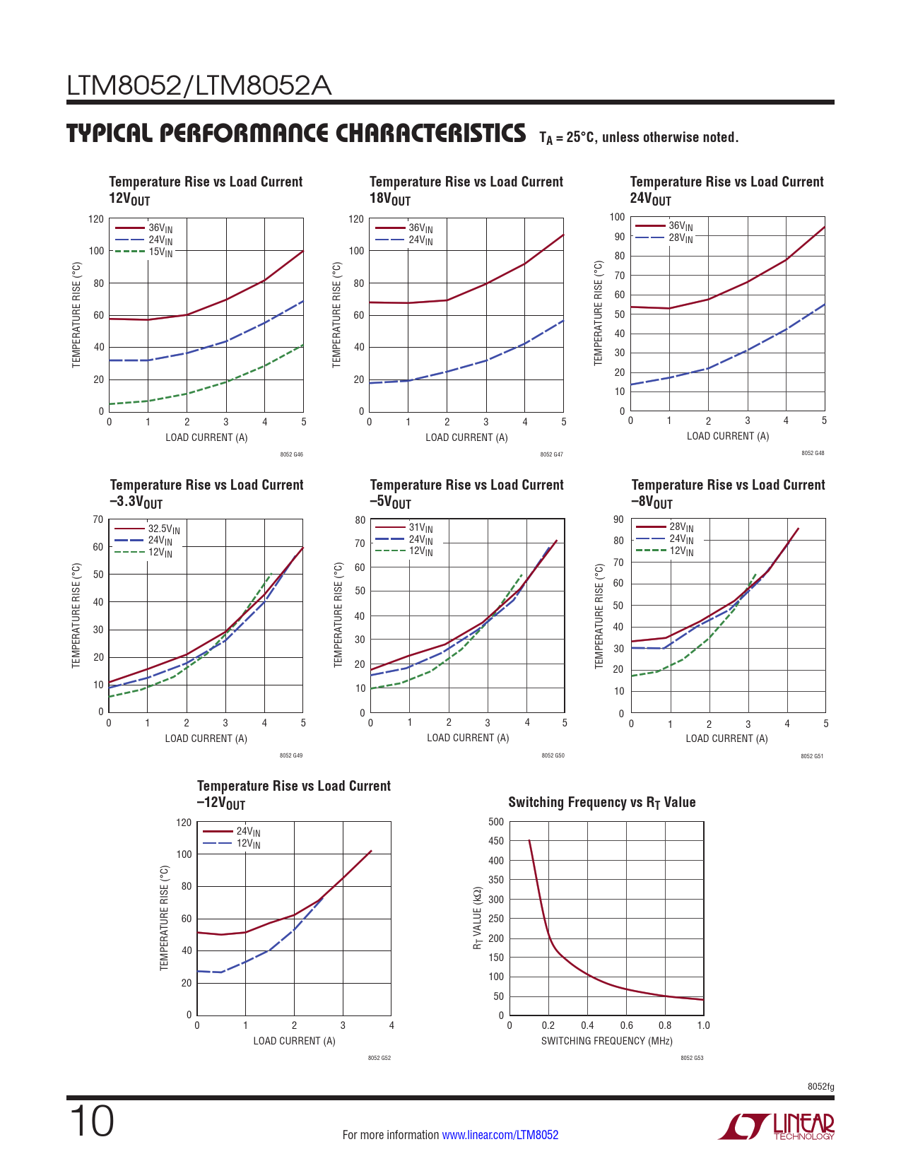 70 80 90 32.5VIN 31VIN 28VIN 24V 24V 24V 60 IN 70 IN 80 IN 12VIN 12VIN 12VIN 60 70 50 60 50 40 50 40 30 40 30 30 20 TEMPERATURE RISE (°C) TEMPERATURE RISE (°C) 20 TEMPERATURE RISE (°C) 20 10 10 10 0 0 0 0 1 2 3 4 5 0 1 2 3 4 5 0 1 2 3 4 5 LOAD CURRENT (A) LOAD CURRENT (A) LOAD CURRENT (A) 8052 G49 8052 G50 8052 G51