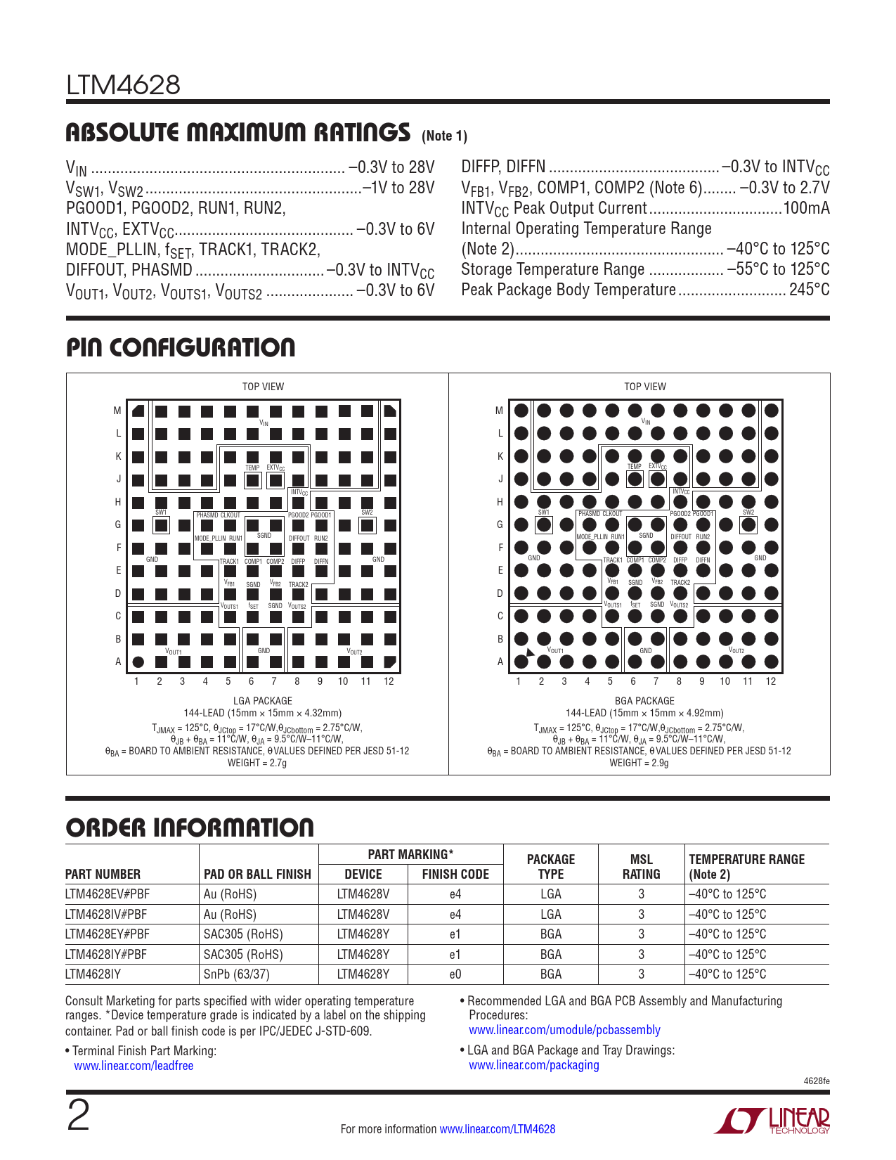VIN ... –0.3V to 28V DIFFP, DIFFN ... –0.3V to INTVCC VSW1, VSW2 ..–1V to 28V VFB1, VFB2, COMP1, COMP2 (Note 6) .. –0.3V to 2.7V PGOOD1, PGOOD2, RUN1, RUN2, INTVCC Peak Output Current ..100mA INTVCC, EXTVCC... –0.3V to 6V Internal Operating Temperature Range MODE_PLLIN, fSET, TRACK1, TRACK2, (Note 2) .. –40°C to 125°C DIFFOUT, PHASMD ... –0.3V to INTVCC Storage Temperature Range .. –55°C to 125°C VOUT1, VOUT2, VOUTS1, VOUTS2 ... –0.3V to 6V Peak Package Body Temperature .. 245°C