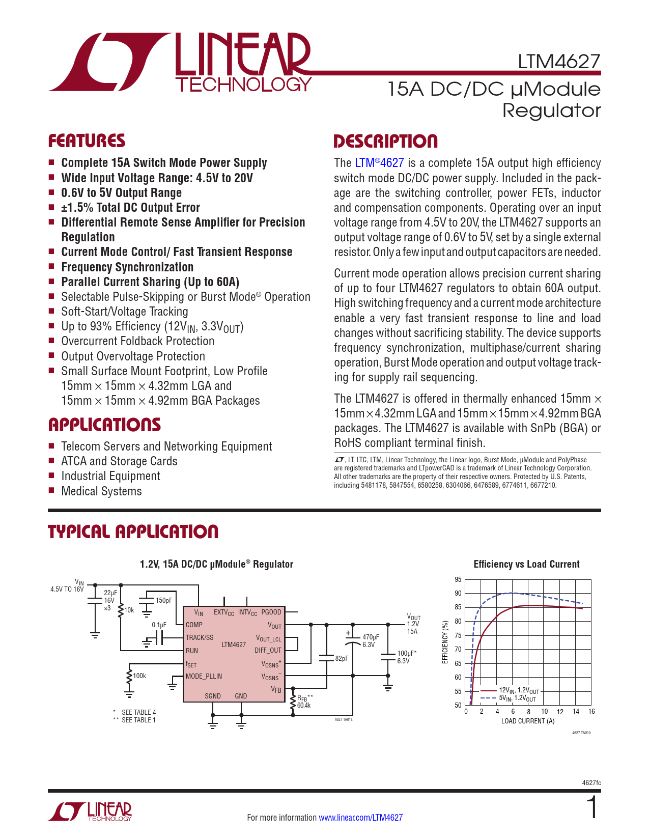 LTM4627 15A DC/DC µModule Regulator FEATURESDESCRIPTION n Complete 15A Switch Mode Power Supply The LTM®4627 is a complete 15A output high efficiency n Wide Input Voltage Range: 4.5V to 20V switch mode DC/DC power supply. Included in the pack- n 0.6V to 5V Output Range age are the switching controller, power FETs, inductor n ±1.5% Total DC Output Error and compensation components. Operating over an input n Differential Remote Sense Amplifier for Precision voltage range from 4.5V to 20V, the LTM4627 supports an Regulation output voltage range of 0.6V to 5V, set by a single external n Current Mode Control/ Fast Transient Response resistor. Only a few input and output capacitors are needed. n Frequency Synchronization Current mode operation allows precision current sharing n Parallel Current Sharing (Up to 60A) of up to four LTM4627 regulators to obtain 60A output. n Selectable Pulse-Skipping or Burst Mode® Operation High switching frequency and a current mode architecture n Soft-Start/Voltage Tracking enable a very fast transient response to line and load n Up to 93% Efficiency (12VIN, 3.3VOUT) changes without sacrificing stability. The device supports n Overcurrent Foldback Protection frequency synchronization, multiphase/current sharing n Output Overvoltage Protection operation, Burst Mode operation and output voltage track- n Small Surface Mount Footprint, Low Profile ing for supply rail sequencing. 15mm × 15mm × 4.32mm LGA and 15mm × 15mm × 4.92mm BGA Packages The LTM4627 is offered in thermally enhanced 15mm × 15mm × 4.32mm LGA and 15mm × 15mm × 4.92mm BGA APPLICATIONS packages. The LTM4627 is available with SnPb (BGA) or n RoHS compliant terminal finish. Telecom Servers and Networking Equipment L n , LT, LTC, LTM, Linear Technology, the Linear logo, Burst Mode, µModule and PolyPhase ATCA and Storage Cards are registered trademarks and LTpowerCAD is a trademark of Linear Technology Corporation. n Industrial Equipment All other trademarks are the property of their respective owners. Protected by U.S. Patents, including 5481178, 5847554, 6580258, 6304066, 6476589, 6774611, 6677210. n Medical Systems TYPICAL APPLICATION1.2V, 15A DC/DC µModule® RegulatorEfficiency vs Load Current V 95 IN 4.5V TO 16V 22µF 90 16V 150pF ×3 10k 85 VIN EXTVCC INTVCC PGOOD VOUT 0.1µF COMP V 80 OUT 1.2V + 15A TRACK/SS V 75 OUT_LCL 470µF LTM4627 6.3V RUN DIFF_OUT 70 100µF* 82pF f + 6.3V EFFICIENCY (%) SET VOSNS 65 100k MODE_PLLIN V – OSNS 60 VFB 55 12VIN, 1.2VOUT SGND GND RFB** 5VIN, 1.2VOUT 60.4k 50 * SEE TABLE 4 0 2 4 6 8 10 12 14 16 ** SEE TABLE 1 4627 TA01a LOAD CURRENT (A) 4627 TA01b 4627fc For more information www.linear.com/LTM4627 1 Document Outline Features Applications Description Typical Application Absolute Maximum Ratings Pin Configuration Electrical Characteristics Typical Performance Characteristics Pin Functions Block Diagram Decoupling Requirements Operation Applications Information Typical Applications Package Description Package Photos Package Description Revision History Typical Application Related Parts