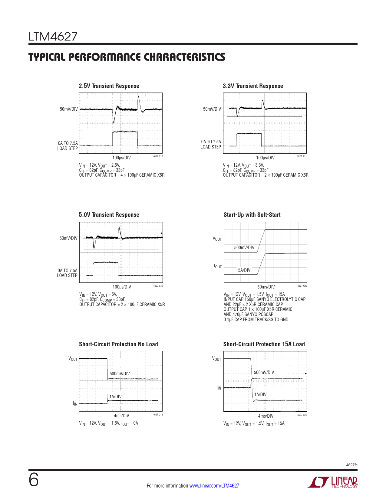 50mV/DIV VOUT 500mV/DIV IOUT 0A TO 7.5A 5A/DIV LOAD STEP 100µs/DIV 4627 G12 50ms/DIV 4627 G13 VIN = 12V, VOUT = 5V, VIN = 12V, VOUT = 1.5V, IOUT = 15A CFF = 82pF, CCOMP = 33pF INPUT CAP 150µF SANYO ELECTROLYTIC CAP OUTPUT CAPACITOR = 2 × 100µF CERAMIC X5R AND 22µF × 2 X5R CERAMIC CAP OUTPUT CAP 1 × 100µF X5R CERAMIC AND 470µF SANYO POSCAP 0.1µF CAP FROM TRACK/SS TO GND